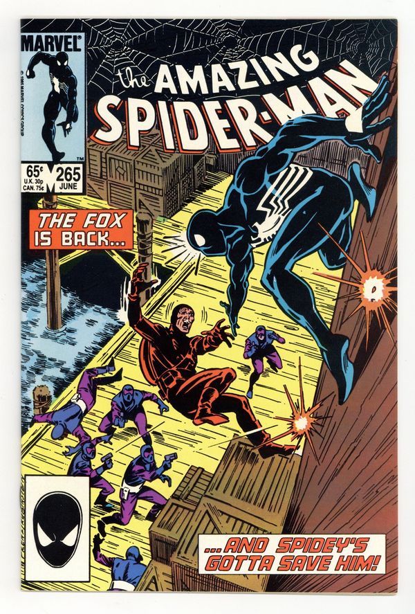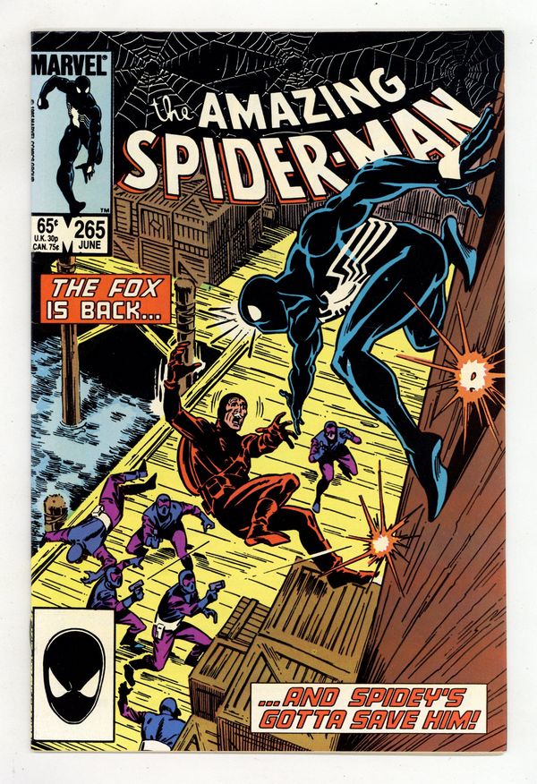 Tags: Marvel Legacy Numbering: Amazing Spider-Man (part 265), Spider-Man$32.50First printing. Direct Edition. First appearance of Silver Sable. Script by Tom DeFalco. Pencils by Ron Frenz. Inks by Joe Rubinstein. Cover by Ron Frenz and Joe Rubinstein. "After the Fox!". The Black Fox is on the run! But it's not the Spectacular Spider-Man who's chasing him! It's Silver Sable! An adventurer for hire from the European country of Symkaria! Silver Sable and her Wild Pack pursue the fox through the streets of Manhattan and then later corner him on the waterfront! However, the aging international jewel thief has a wall-crawling guardian angel! Down on the docks, the sparks fly as the web-slinger gives Silver Sable a lesson in diplomacy...superhero-style! Second appearance of the Black Fox. Cameo appearances by Aunt May, Mary Jane Watson, Harry Osborn, Liz Osborn, and Normie Osborn. (Notes: Silver Sable appears next in Amazing Spider-Man 279. The Black Fox returns in Web of Spider-Man 14. There is a second printing of this issue published in 1992. The second printing features a gray cover and a yellow dog ear touting the first appearance of Silver Sable. This story was also reprinted in Marvel Tales 277.) 36 pgs. Cover price $0.65.