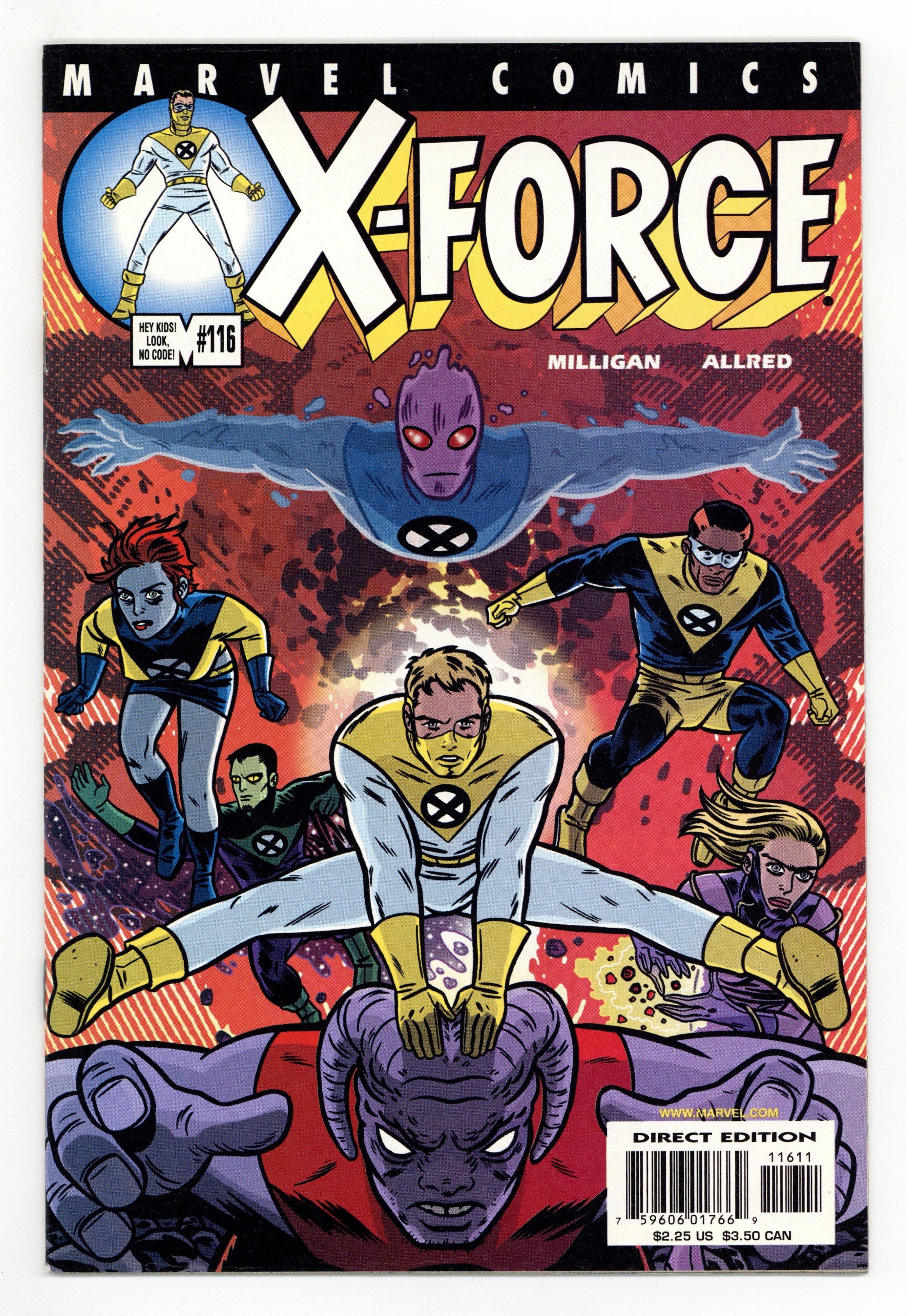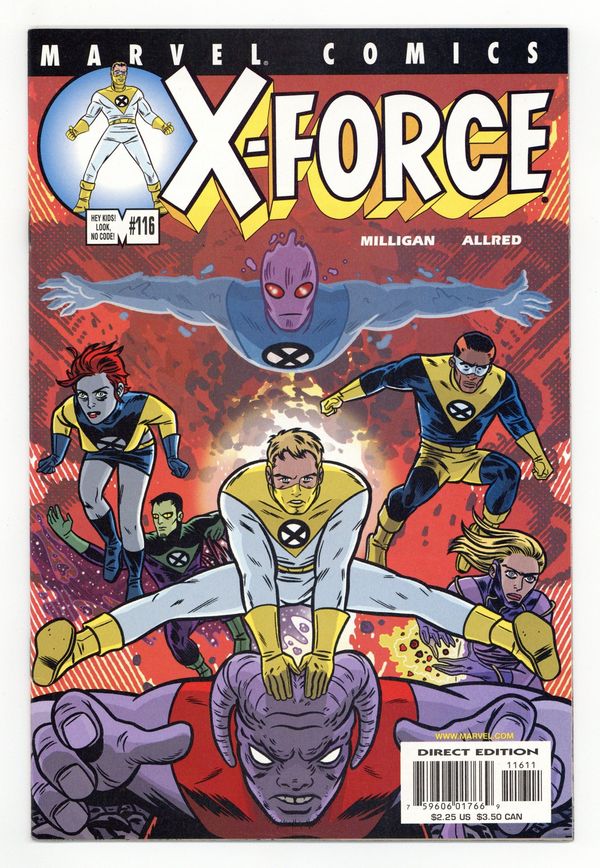 Direct Edition. Story by Peter Milligan. Cover and Art by Mike Allred. It's a new era for X-FORCE as writer Peter Milligan (Shade The Changing Man, Human Target) and penciler Mike Allred (Madman, Atomics) bring an exciting, controversial and innovative vision to the title! Professor X had a dream, that mutants and humans could live in peace and harmony. A new squad of operatives calling themselves X-Force are living that dream. These eight mutants are cashing in on their special skills to preserve the Free World from the Forces of Evil, but at no small cost to themselves. Adored by humans, reviled by their fellow mutants, X-Force has successfully "crossed over." Problem is, there may be no going back! Meet the new team: Zeitgeist, U-Go Girl, The Anarchist, Battering Ram, Plazm, Gin Genie, La Nuit and their amorphous assistant Doop! Eight mutants who've teamed together to do the big dirty jobs that others can't. Eight mutants who shine in the blinding lights of the media ? but strike in the dark of night. Eight mutants who've agreed to burn brightly and ? as you'll see ? burn fast!? THE CREATORS: Take the dark and paranoid writings of Peter Milligan. Blend with the pop surreal stylings of Mike Allred. Mix in the special spice that is X. Serve over ice and enjoy! ? THE FORMAT: 32 pages, with ads. Cover price $2.25.