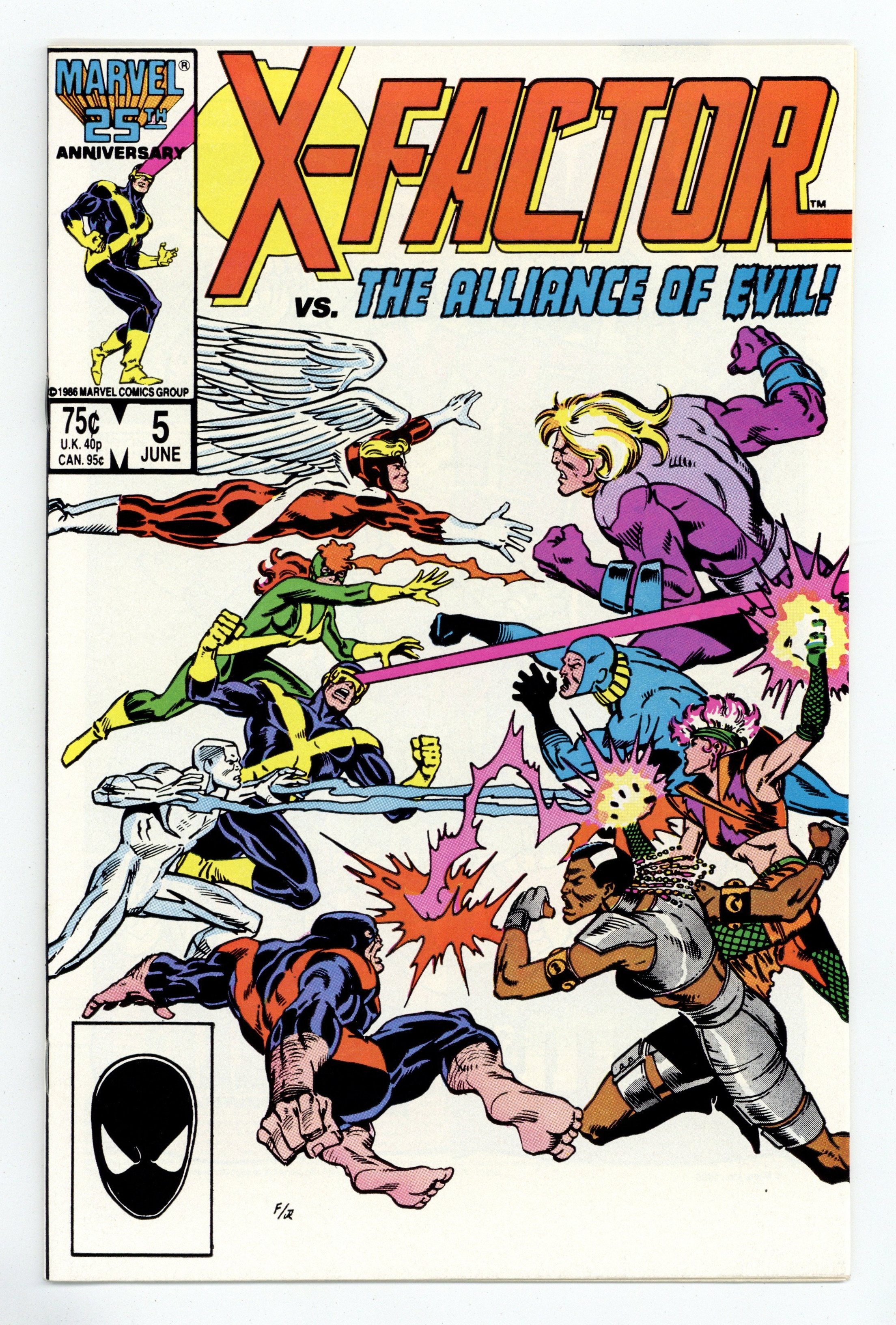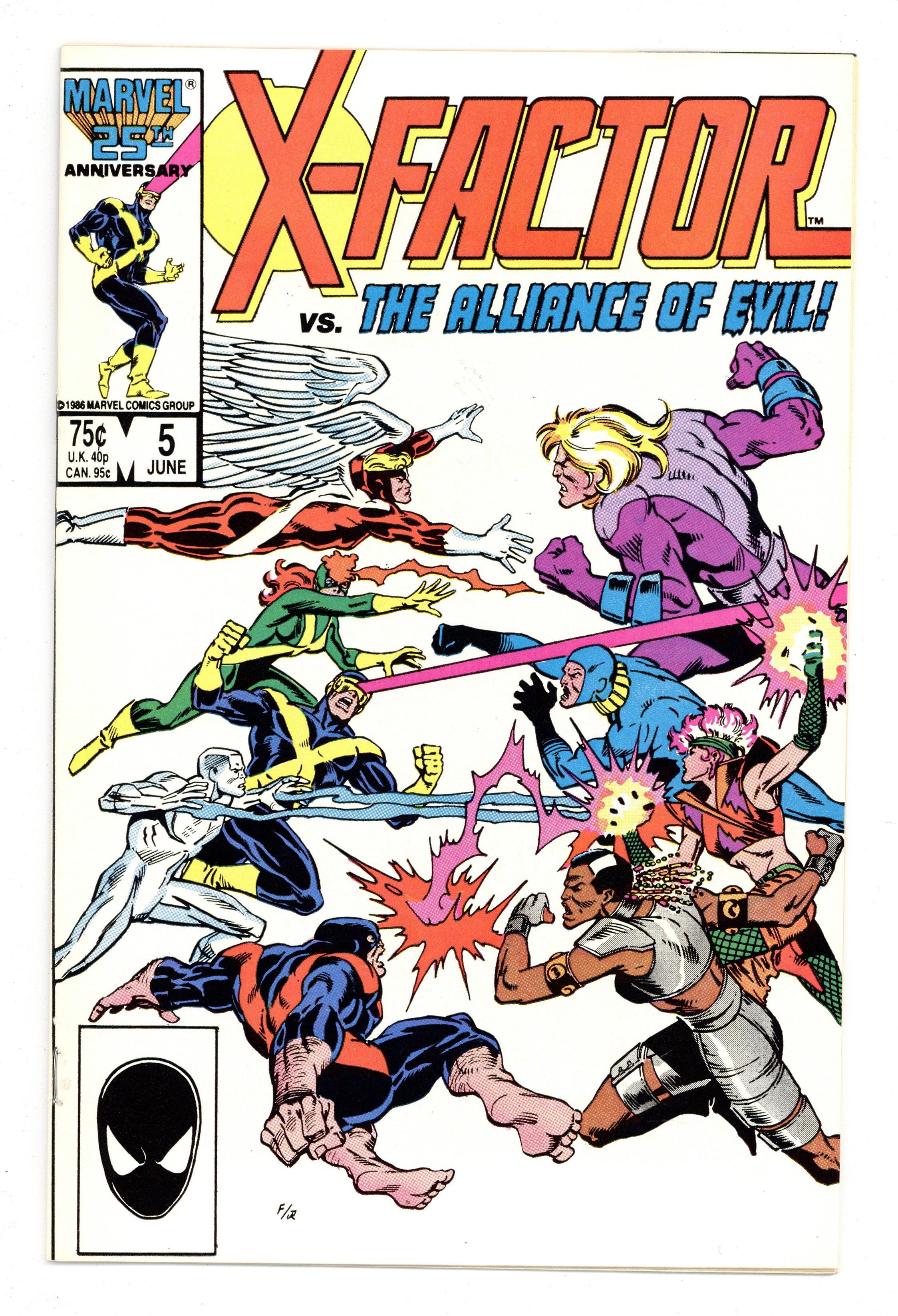 Direct Edition. "Tapped Out!" Part 1 of 2. 1st appearance of Apocalypse (shadowed cameo). Story by Bob Layton. Art by Jackson Guice and Joe Rubinstein. Cover by Ron Frenz and Joe Rubinstein. It's a classic super-hero/super-villain throw-down when X-Factor must battle the Alliance of Evil (Frenzy, Tower, Stinger, and Timeshadow) for the life of a mutant. Featuring a new menace by the name of Apocalypse, an evil mutant who will become a major thorn in the sides of the X-Men and X-Factor. Cover price $0.75.