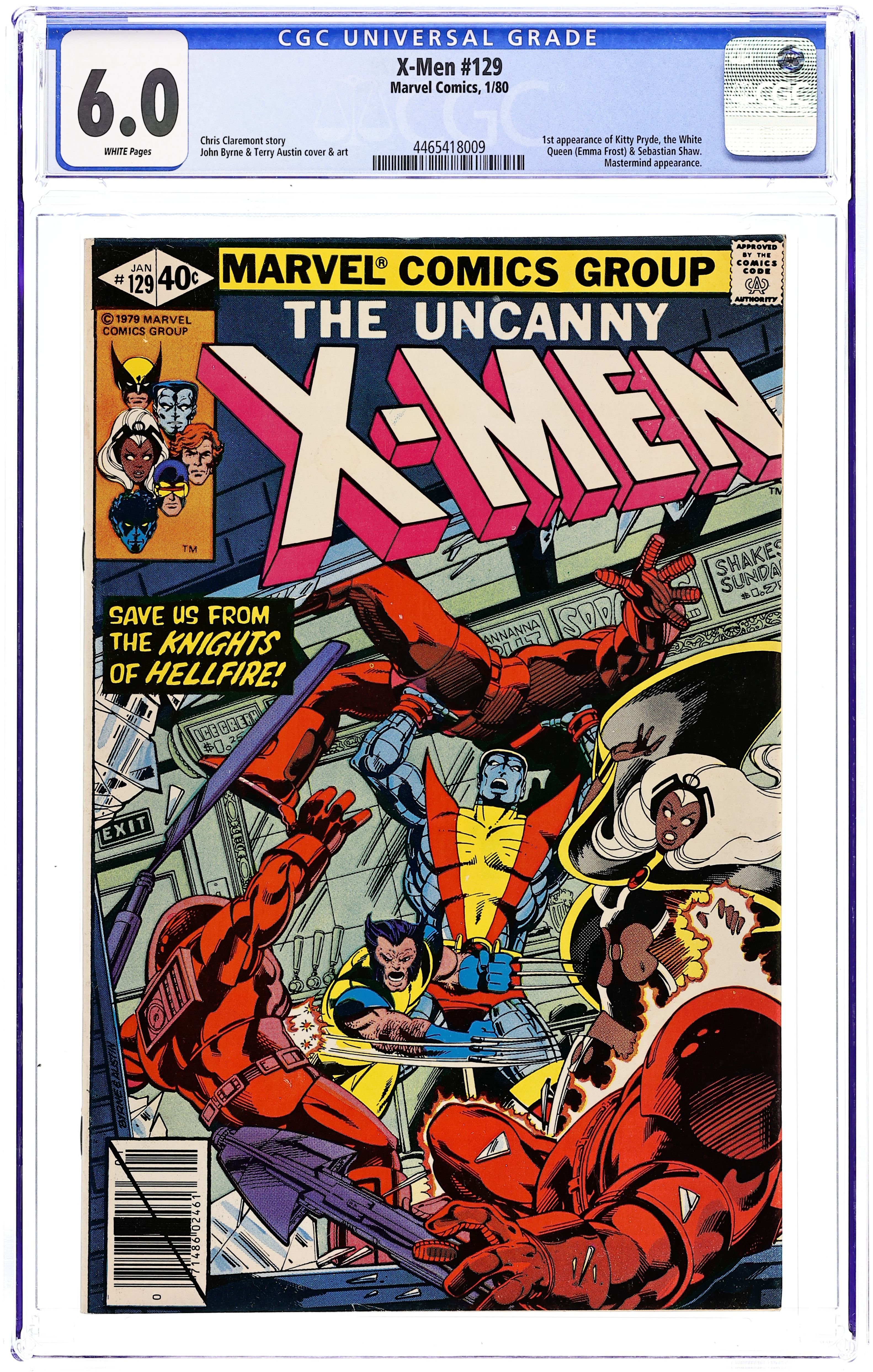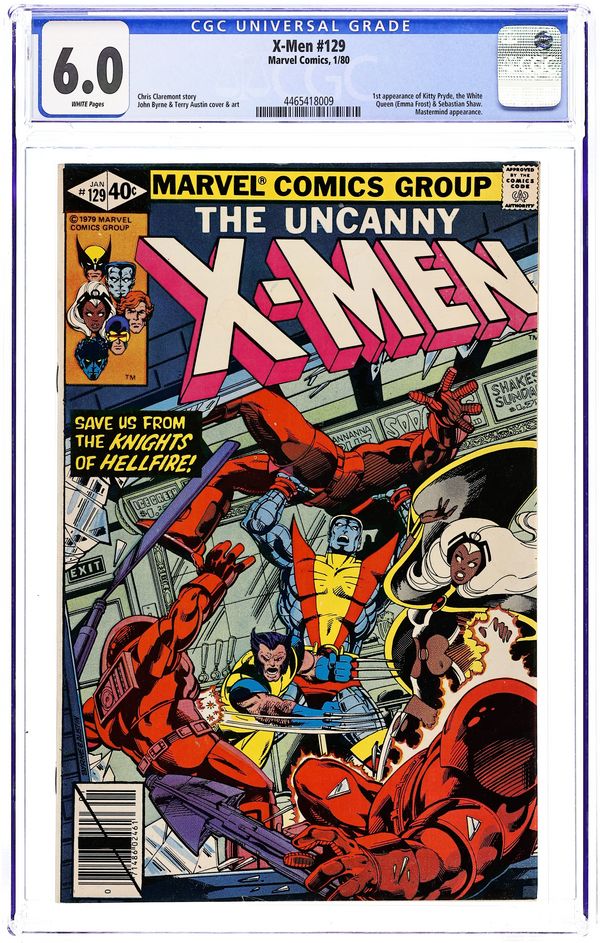 Direct Edition. The Dark Phoenix Saga: Part 1 of 9 - "God Spare the Children!" Story by Chris Claremont and John Byrne. Art by John Byrne and Terry Austin. This issue begins arguably the greatest and most tragic X-Men adventure of all time - The Dark Phoenix Saga. While the X-Men attempt to recruit a "New Mutant" by the name of Kitty Pryde, Wolverine, Colossus, and Storm are suddenly attacked by unknown assailants. What do these armored foes want, and who is the White Queen? 36 pages, full color. NOTE: 1st appearance of Kitty Pryde and Emma Frost, the White Queen. Cover price $0.40.
