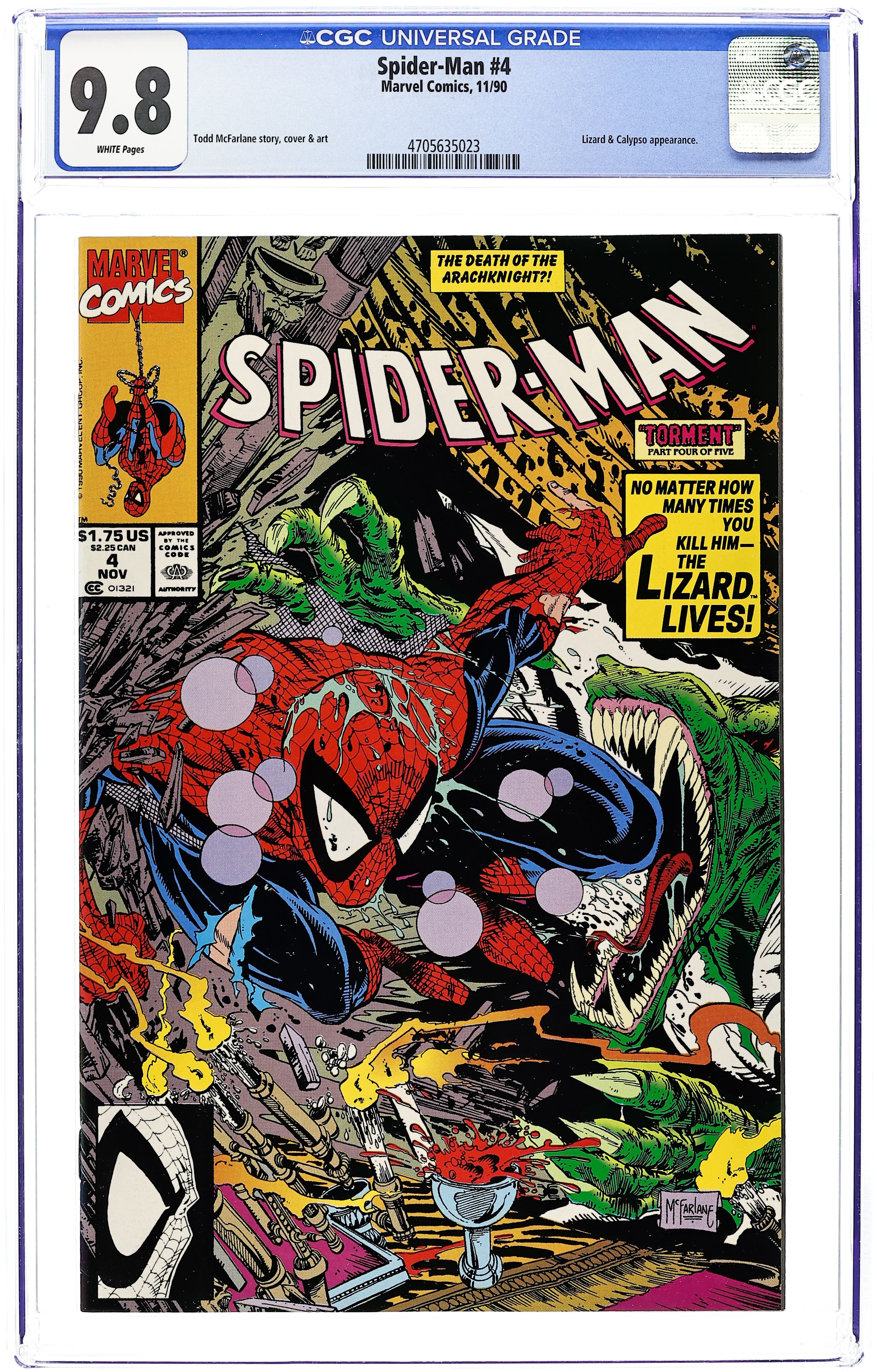 Tags: Spider-Man$20.50Direct Edition. Torment Part 4 of 5. "The Lizard Lives!" Script and art by Todd McFarlane. Cover by Todd McFarlane. At last Spider-Man meets his tormentor! The person behind the potions, the poisons, the drums, and the Lizard's homicidal rampage -- is a woman! And she is somehow connected to one of the wall-crawler's departed foes: Kraven the Hunter! Unfortunately, the weakened web-slinger is her captive. And the deranged Lizard is standing guard. How will the amazing one escape his perilous predicament? Cameo appearances by Mary Jane Watson and Calypso. 32 pages. Cover price $1.75.