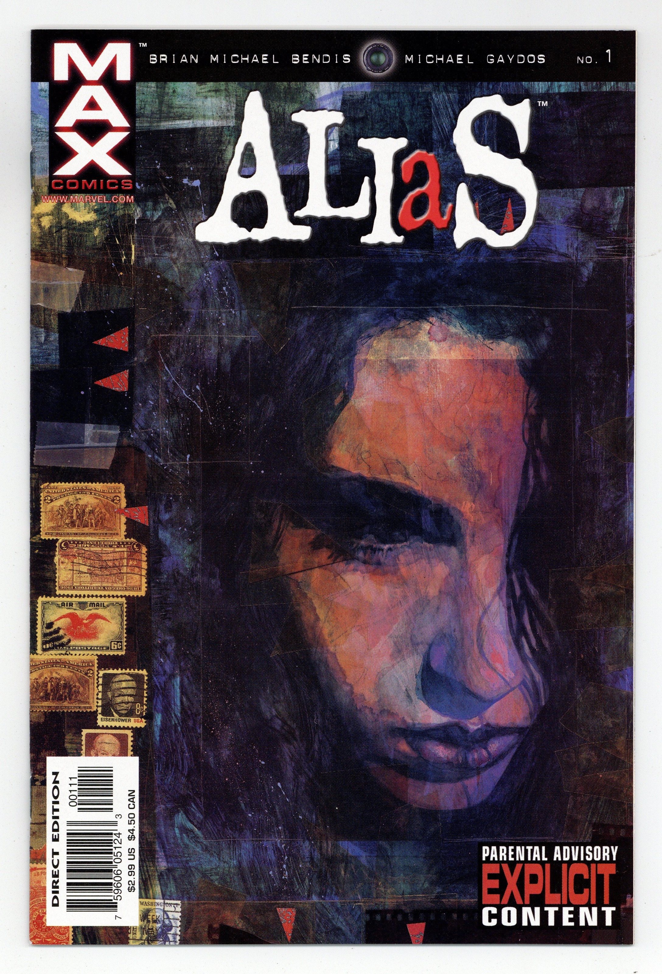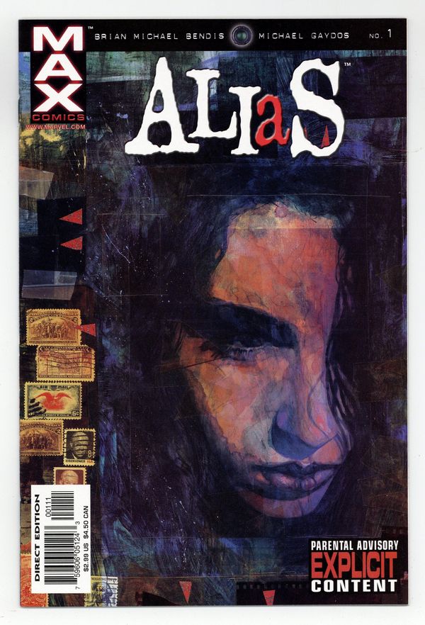 Painted cover by David Mack. Written by Brian Michael Bendis, pencils by Michael Gaydos. 1st MAX title. Jessica Jones is a former unremarkable, cut-rate costumed super hero turned self-destructive, alcoholic private investigator, who specializes in super-human cases. Adult oriented, character driven crime drama in the vein of Bendis' "Jinx" and "Powers." Luke Cage appearance. Contains explicit content. MATURE READERS. Cover price $2.99.