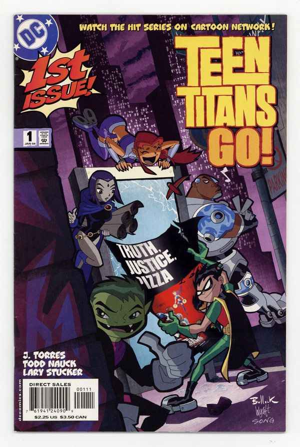 First printing. Direct Edition. WRITTEN BY J. TORRES, ART BY TODD NAUCK AND LARY STUCKER; COVER BY DAVE BULLOCK In stores November 26. From Cartoon Network, it's TV's hottest new super-team! Join Robin and his band of teenage heroes: the brave Cyborg, funny guy Beast Boy, the naive but seriously hot (and way powerful) Starfire, and the moody goth-girl Raven as they battle for truth, justice and pizza! FC, 32 PG.$2.25 Cover price $2.25.