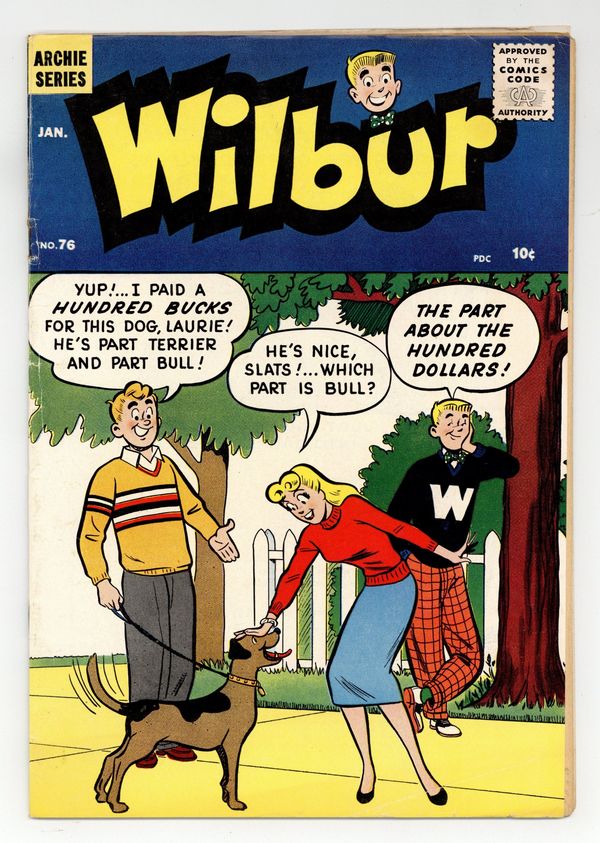 "Mirthquake"; Slats goes to a store each day and buys a list of jokes for the day; However, he doesn't know that Red writes them; The jokes don't make sense, but Red tells the gang to laugh so that Slats will look like an idiot. Little Archie ad. "The Waiting Game!"; Once again, Slats and Linda scheme to break up Wilbur and Laurie. Archie ad. "Pool Sharks"; Wilbur and Red are assigned to pick up chlorine and put it in Mr. Lake's pool; Instead, they put butterscotch pudding mix in the pool. "The Dress"; Laurie has dress problems. 36 pgs., full color. $0.10. Cover price $0.10.