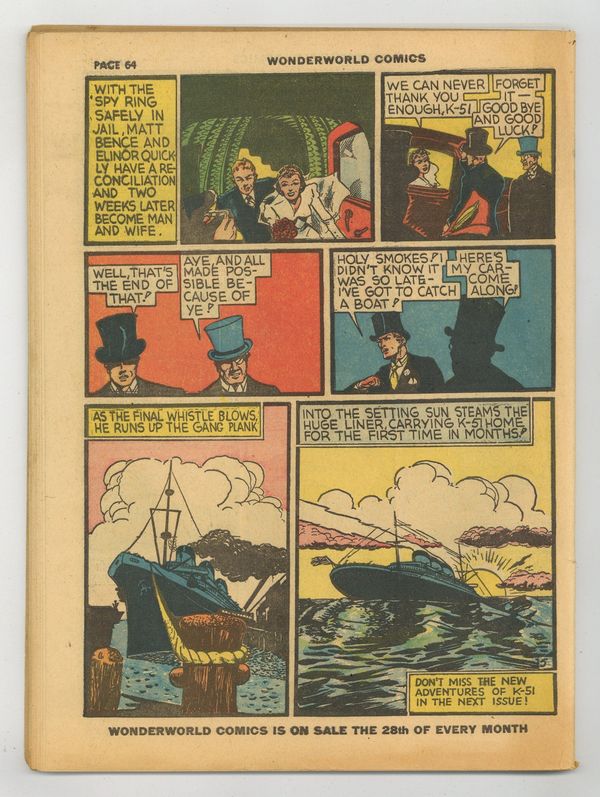 Cover art by Lou Fine. Celllini's Long-Distance Destroyer starring Flame and Mike Cellini. Yarko story. Shorty Shortcake story, script and art by S. M. Iger (Jerry Williams). The Farmhouse Murder Mystery starring Patty O'Day and Von Mitz, art by Claire Moe (Vic Todd). The Isle of Sighs starring Dr. Fung, art by Bob Powell (Arthur Dean). Tommy Taylor in Alaska text story by William T. Libby. Massacre At Moose Mountain starring Tex Maxon, the Phantom Rider, art by Munson Paddock (Cecilia Munson). Visiting the Empire State starring Don Quixote. Mission To Tato starring Spark Stevens, script and art by Klaus Nordling. Sir Malcolm's Double--K-51 Spies At War. 68 pgs. $0.10. Cover price $0.10.