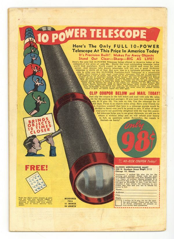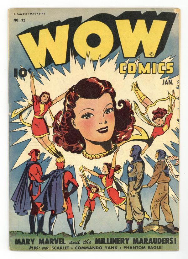 Cover by Jack Binder. Stories and art by Otto Binder, Jack Binder, and Marc Swayze. A Fawcett anthology with an emphasis on superhero adventure. Mary Marvel investigates why gangsters are stealing the designer women's hats created by convict Smooth Felt. Phantom Eagle follows the trail of the mystical war-creating Black Mace to the Cave of the Vikings. Mr. Scarlet and Pinky discover that Scarlet's former secretary Miss Wade is now in the Women's Army Corps, and accused of embezzling supplies by a corrupt soldier. Plus a PSA for wartime paper drives featuring Mary Marvel. Mary Marvel: The Millinery Marauders; Commando Yank: The Mikado's Vase; Phantom Eagle: The Cave of the Vikings; Penny Graves: Vale of Treachery; Mr. Scarlet and Pinky. 32 pages, Full Color. Cover price $0.10.