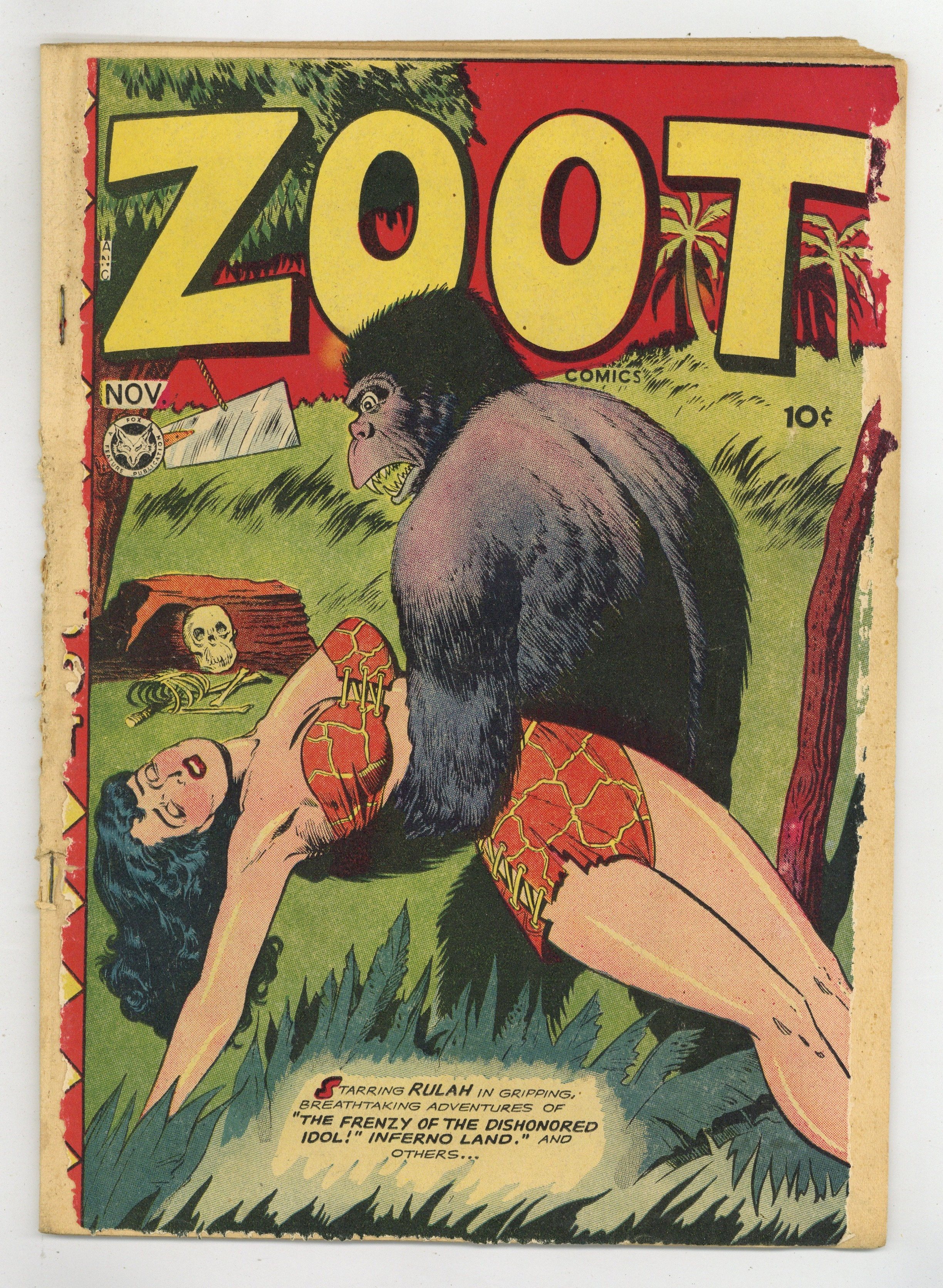 In order of appearance: "Rulah Jungle Goddess, Frenzy of the Dishonored Idol!" reprinted in Jungle Girls (1988) #5; "Rulah Jungle Goddess, The Ice Beast..." reprinted in Jungle Girls (1988) #5 and Men of Mystery Comics (1996- AC Comics) #85; "Rulah Jungle Goddess, The Harpies From Hades!"; and "Tropical Topics, The Pigmy". "The Big Paw" text story. Indicia states "ZOOT COMICS". 36 pages. Full color. Cover price $0.10.