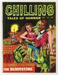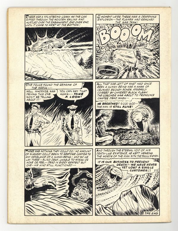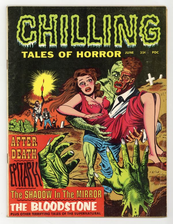 Published Jun 1969 by Stanley Publications.$36.00Cover by Bernard Baily. Stories and art by Sal Trapani, S. Finocchiaro, Jon Blummer, Vince Fodera, Petrizza, Avery West, Roy Marvin, and Les Zakarin. A lurid horror magazine from Stanley Morse Publications featuring tales of ghouls, vampires and the undead. A man murders his contemptuous wife, only to have her reincarnate as a vengeful housecat, in a story featuring a death-by-kitty panel. A cruel fisherman gets his comeuppance from sea creatures seeking fishy justice. Ghosts rise to reveal their living secrets in epitaphs, giving Edgar an unpleasant surprise about his late wife. Epitaph; The Shadow in the Mirror; After Death; I Killed Mary; The One That Got Away; Dream; The Bloodstone; Bum Ticker; Life Insurance. 8 1/2-in. x 11-in., 48 pages, B&W. Cover price $0.35.