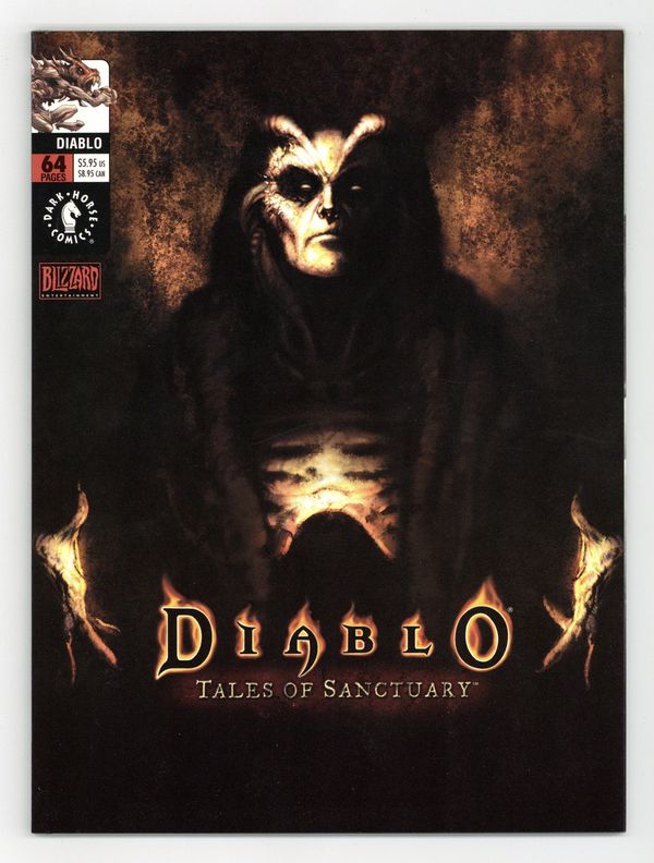 Published Nov 2001 by Dark Horse.$24.00by PHIL AMARA, DAVE LAND, and FRANCISCO RUIZ VELASCO; cover by FRANCISCO RUIZ VELASCO Grab your sword and follow us as we venture deep into the world of Diablo in Tales of Sanctuary. Collecting three stories of horror, adventure, and action featuring characters and creatures from the hit video game Diablo! Follow the Barbarian Renit and Necromancer Cairo as they search the fabled "Hand of Naz" in order to overcome a demon horde. Meet a Paladin named Hale as he fights an evil that will cause him to question the very nature of his existence. Witness the Druid Azgar as he fights to defend his village and the demons that lie deep within him! Illustrated by master comics artist Francisco Ruiz Battlegods Velasco, Diablo: Tales of Sanctuary will slake your thirst for adventure and leave you crying for more! On sale November 14 FC, 64pg (one-shot) . . . $5.95 Cover price $5.95.