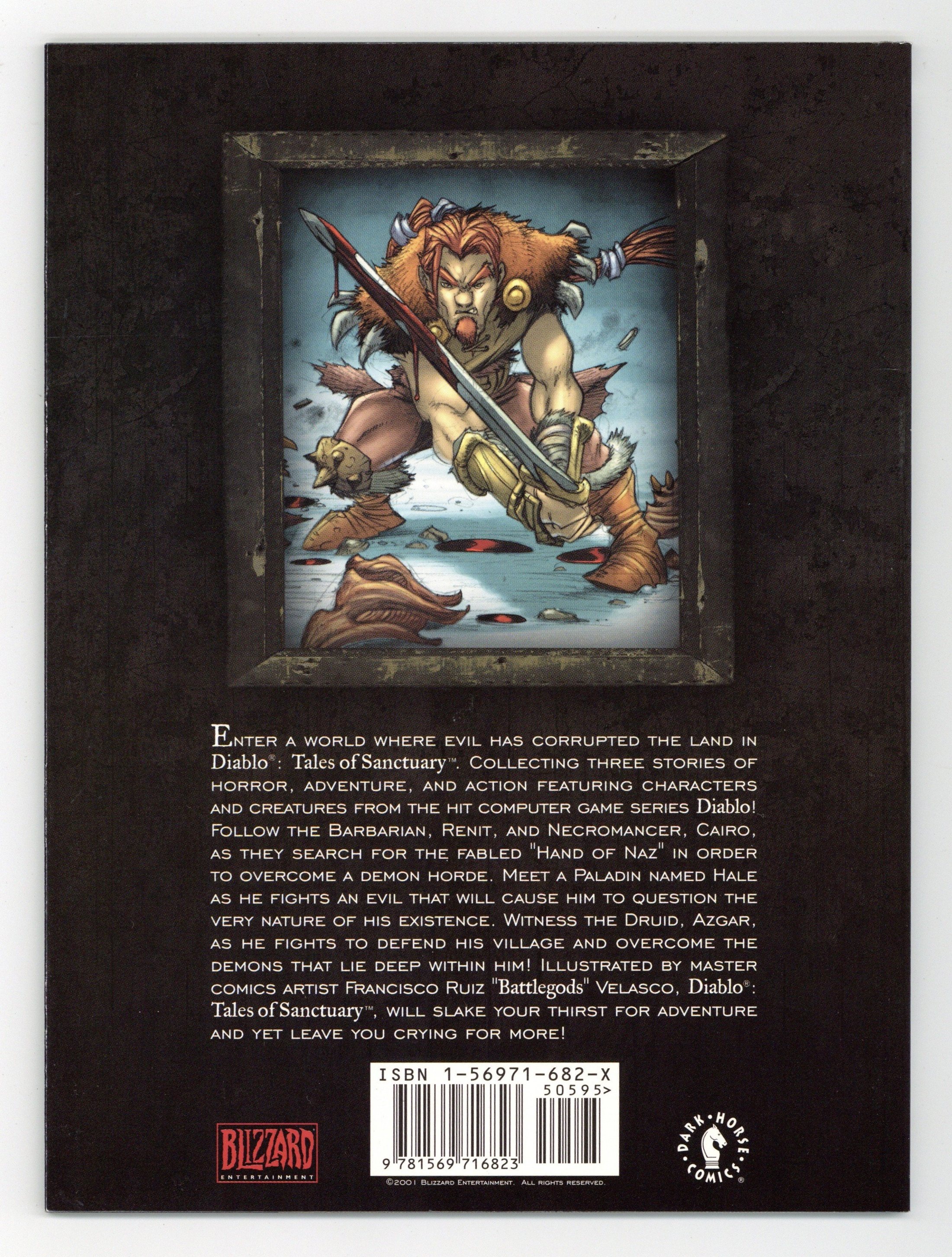 Published Nov 2001 by Dark Horse.$45.00by PHIL AMARA, DAVE LAND, and FRANCISCO RUIZ VELASCO; cover by FRANCISCO RUIZ VELASCO Grab your sword and follow us as we venture deep into the world of Diablo in Tales of Sanctuary. Collecting three stories of horror, adventure, and action featuring characters and creatures from the hit video game Diablo! Follow the Barbarian Renit and Necromancer Cairo as they search the fabled "Hand of Naz" in order to overcome a demon horde. Meet a Paladin named Hale as he fights an evil that will cause him to question the very nature of his existence. Witness the Druid Azgar as he fights to defend his village and the demons that lie deep within him! Illustrated by master comics artist Francisco Ruiz Battlegods Velasco, Diablo: Tales of Sanctuary will slake your thirst for adventure and leave you crying for more! On sale November 14 FC, 64pg (one-shot) . . . $5.95 Cover price $5.95.