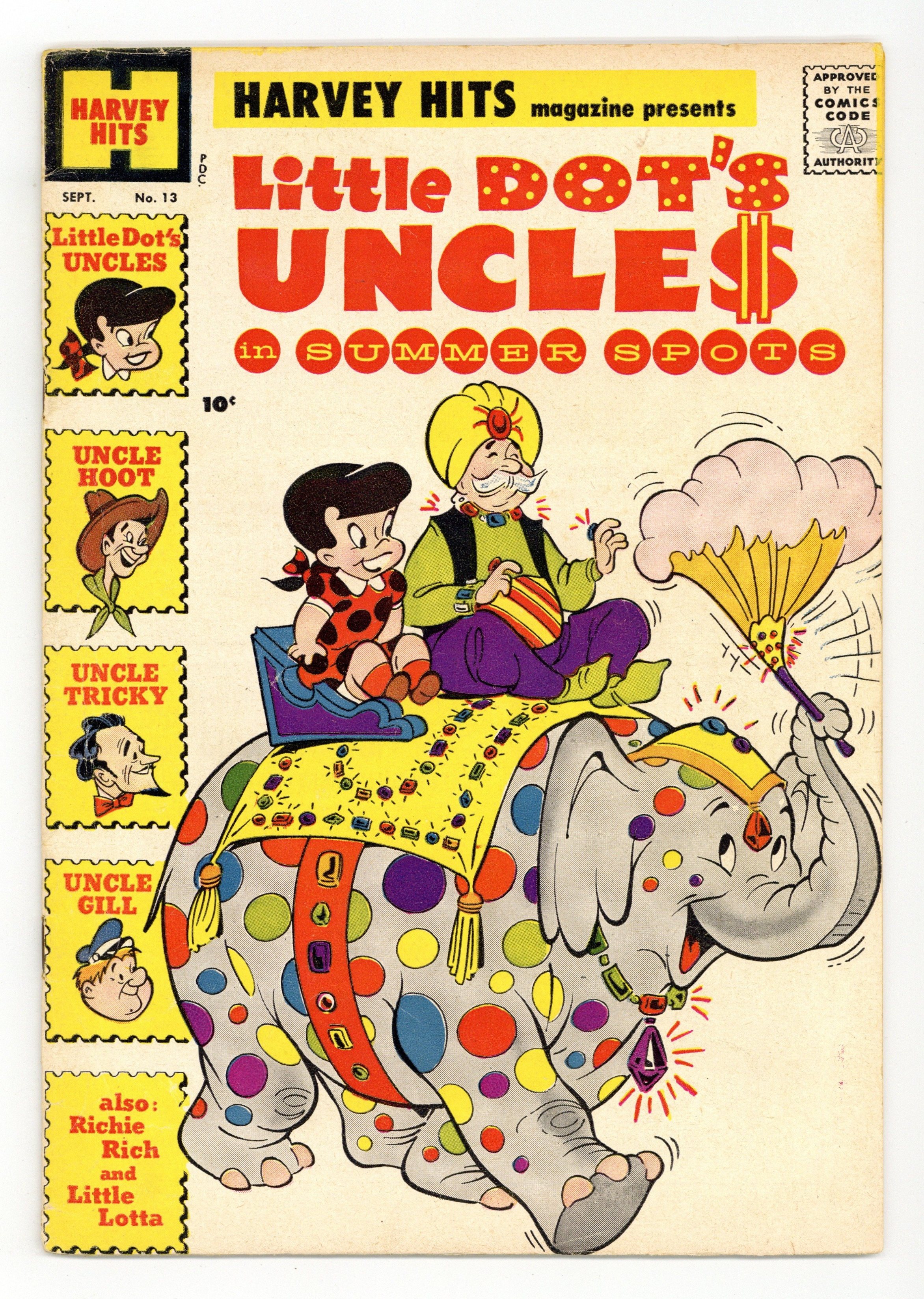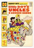 $36.00A showcase anthology that launched many of Harvey's long-running titles. This issue features a Little Dot spinoff featuring Dot's innumerable aunts and uncles, each a different kind of oddball. Dot rides in the rodeo with her cowboy uncle, Hoot. She goes deep-sea fishing with her sea captain uncle, Gill, and fights an octopus. Then she joins her magician uncle Tricky onstage as his assistant. Plus adventures of Richie Rich and Little Lotta. Uncle Hoot: Rough and Tumble; Richie Rich; Moth's Ball; Uncle Gill: Uncle Tricky; Lotta; Peace and Riot; Lotta: Lost and Food. 32 pages, Full Color. Cover price $0.10.