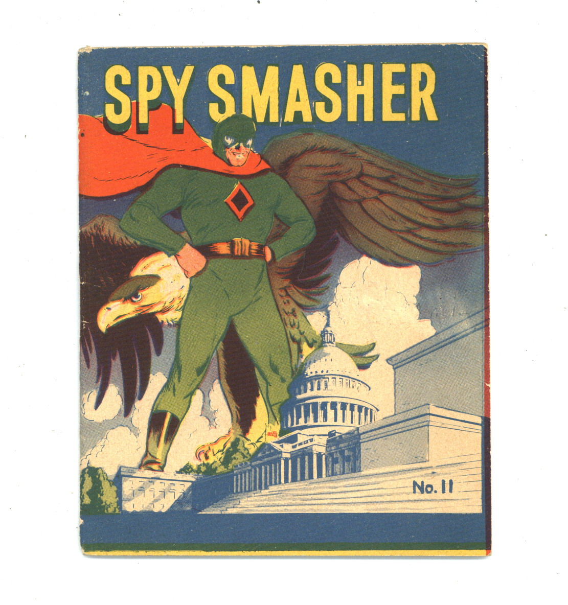Version with War Bond stamp on an otherwise blank back cover. Spy Smasher stars in "Once a Navy Man, Always a Navy Man," "Virginia, Mother of Fighting Americans," and "The Island of Whanno!" This comic measures approximately 5" X 4" and features 34 pages in black, white, and red. Also features full color cover. Listed as Mighty Midget Comics in Overstreet.