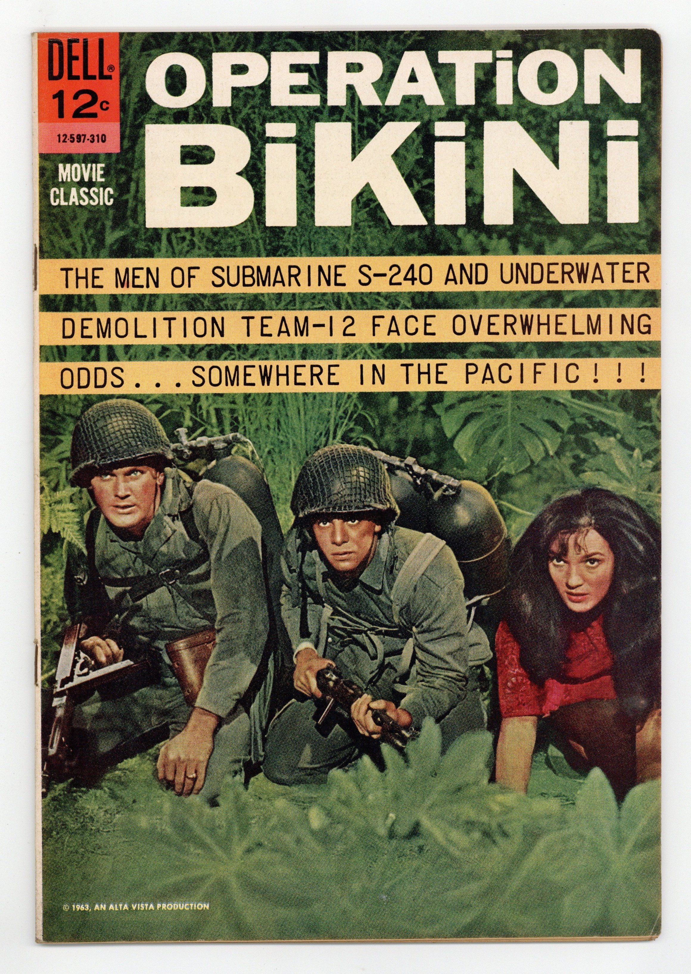 Art by Joe Sinnott, Dick Giordano and Vince Colletta. Cover number is #12-597-310. Dell Movie Classics presented comics based on Hollywood films (not all of them classics). This issue is based on the 1963 war movie from AIP, featuring cast members from the Beach Party movies and musical color sequences with Frankie Avalon. A curious mix of teen-oriented film and old-fashioned war movie, Operation Bikini involves a submarine transporting young intelligence officers during WWII. But the sub crew would rather be out fighting the war, until they see where their mission is leading them. Art by future Fantastic Four legend Joe Sinnott. Plus an article about submarines. Operation Bikini; Subs. 32 pages, Full Color. Cover price $0.12.