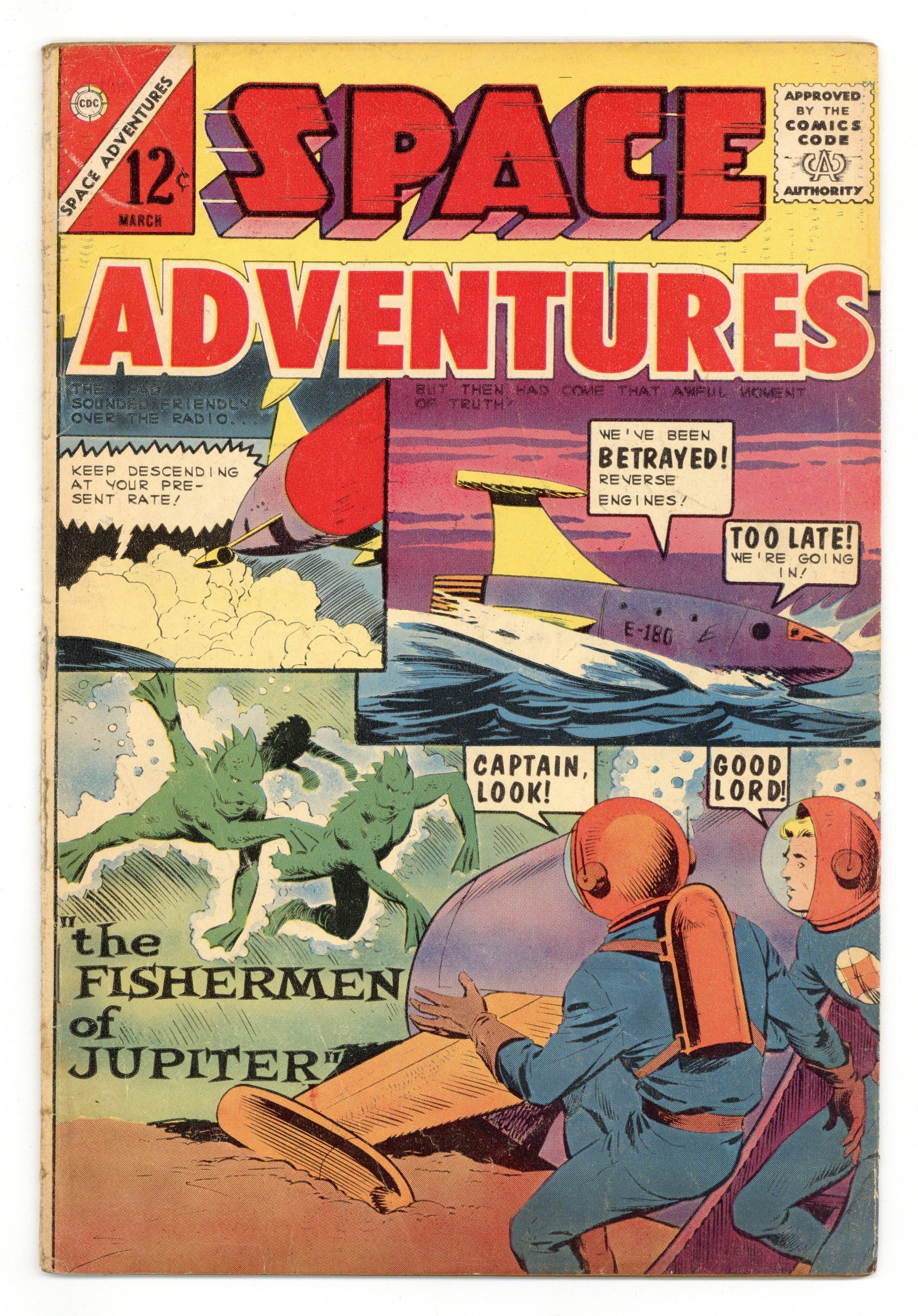 Cover by Dick Giordano. Stories and art by Bill Molno and others. Sci-fi and super-heroics from Charlton Comics. Astronauts exploring beneath the "seas" of Jupiter are attacked by gray Gill-Man-like creatures. Eartrhmen feel they're braving the dangers of the universe to explore new worlds - but the women of the planet Lugo don't quite see it that way. One lone human is all that stands between Earth and an alien invasion. The Fishermen of Jupiter; The Captive; When the Air Froze; The Birthday Present; All Alone; Space Narcosis. 32 pages, Full Color. Cover price $0.12.