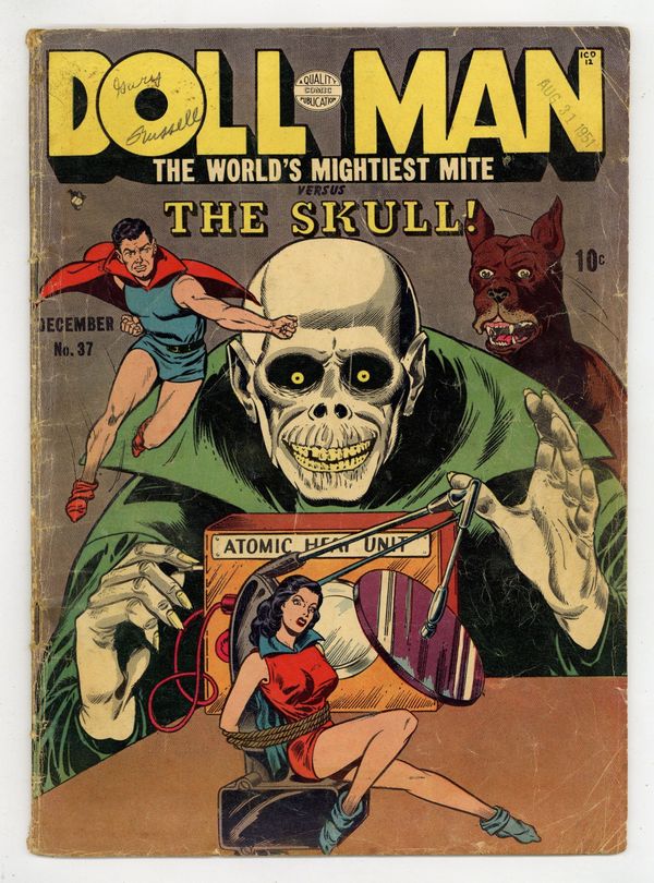 If this issue's wonderfully bizarre bondage cover wasn't cool enough, it's also the first appearance of Dollgirl. This issue also features a Torchy story with pencils by Gill Fox. Battles the Skull; Martha is on a train reading up on will power when the train is raided by The Skull, who was after Darrel's crago of Thorium; Elmo is kenneled in the compartment and alerted Doll Man to the danger. The Construction Gig starring Torchy, art by Gill Fox. The Worshippers of the Golden Ram starring Doll Man, Miktar, and the Golden Ram worshippers. Desperate Journey starring Doll Man, pencils by Dan Zolnerowich. 36 pgs. $0.10. Cover price $0.10.