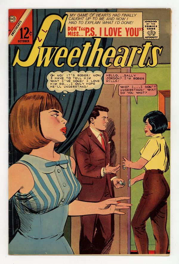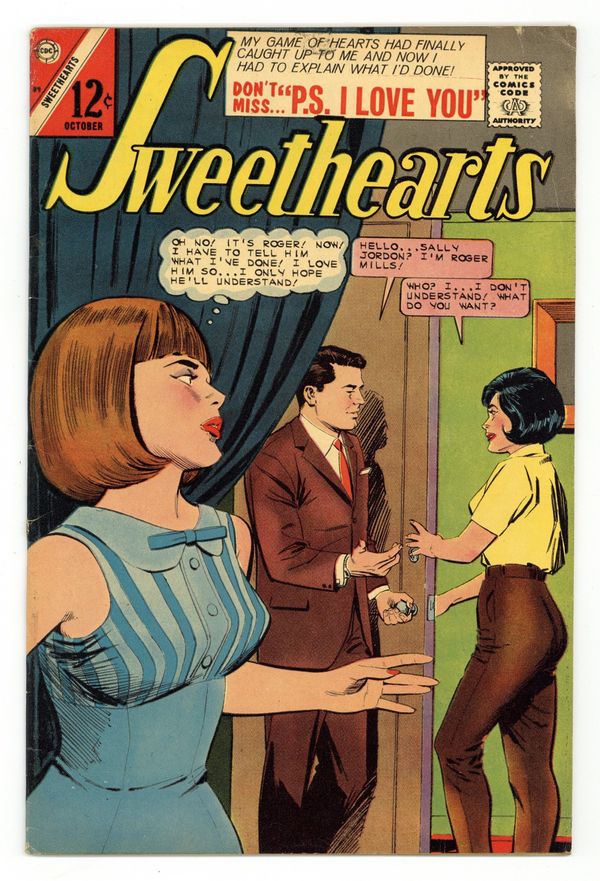 Published Oct 1966 by Charlton Comics Group.$23.00Cover by Dick Giordano. Stories and art by Sal Gentile, Vince Colletta, Charles Nicholas and Jon D'Agostino. Sweethearts was Charlton's continuation of the first monthly romance title, lasting from the romance boom of the '50s until the early '70s. Cindy's life is changed twice, once when she rescues an injured dog, and then again when she meets its grateful owner, handsome Tom. Barbara marries Rob just so he won't be drafted, but doesn't know how to tell him she really loves him, in a story reflective of its era, 1966. Becky starts a pen-pal romance with Roger by masquerading as her older sister Sally, but doesn't know what to do when he wants to meet in person. Boy Meets Girl; I Married a Draft Dodger; Let's Be Friends; The Love of a Ronin; P.S. I Love You. 32 pages, Full Color. Cover price $0.12.