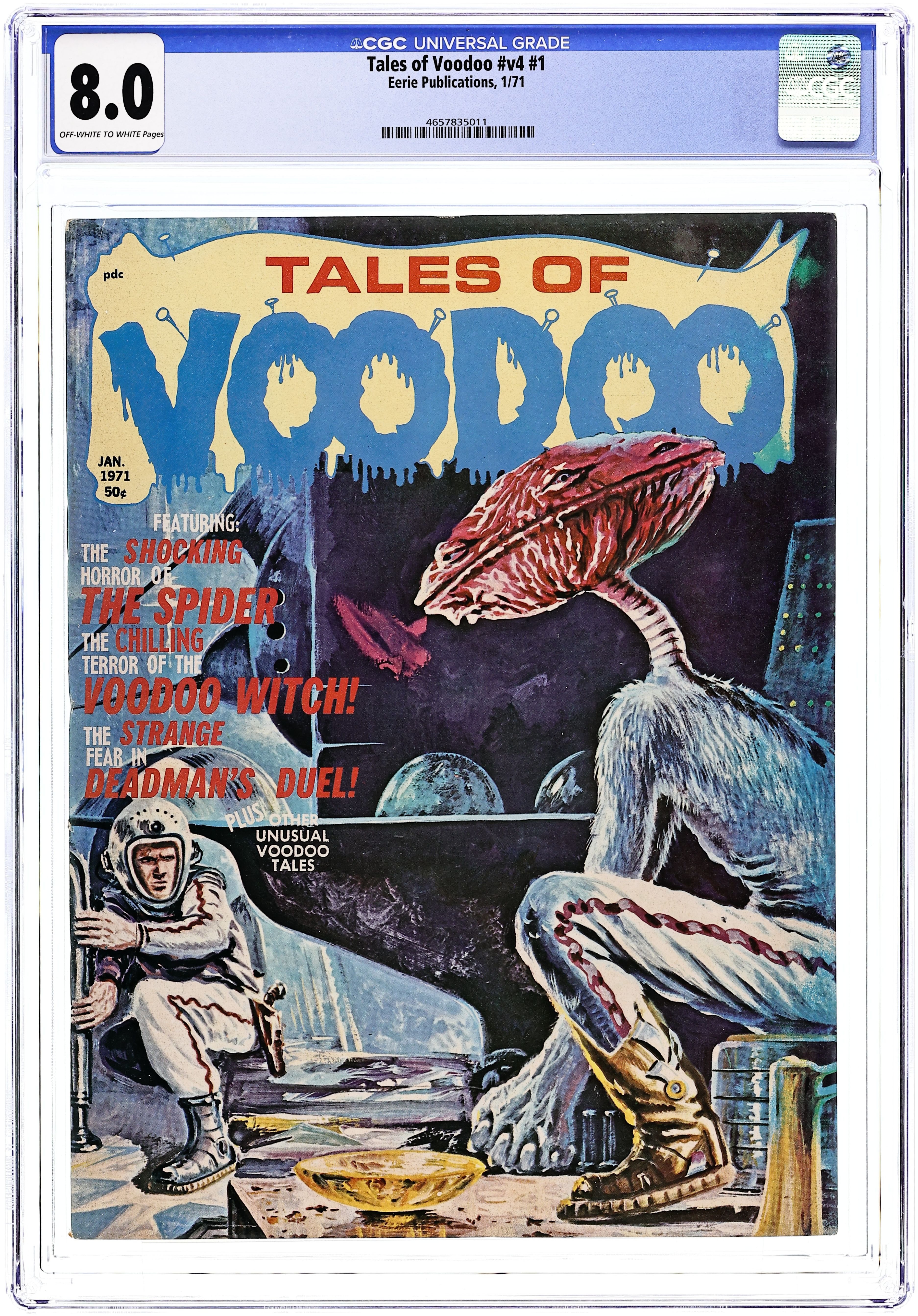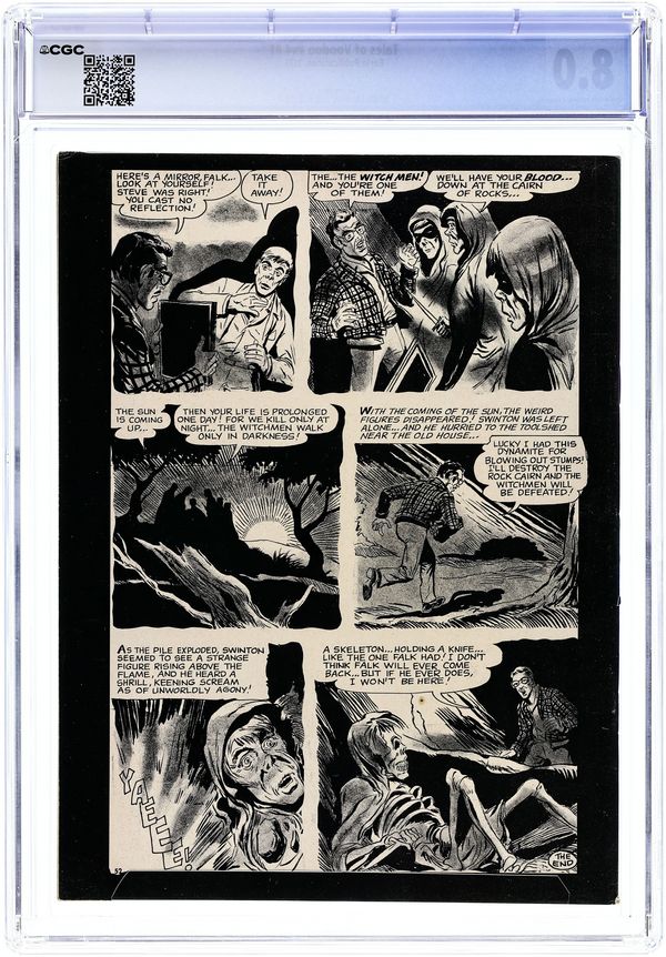 Painted cover by Johnny Bruck. Stories and art by Carl Burgos, Oscar Stepancich, Chic Stone, Oscar Fraga, Dick Ayers and Walter Casadei. Legendary publisher Eerie's fondly remembered tales of horror and the macabre, many "reanimated" from classic pre-Code horror comics with new art. The story of Tituba, the Haitian servant who was accused of witchcraft during the infamous Salem witch trials. A silk merchant gets an offer he can't refuse from a beautiful woman, but the woman is not what she seems. A swordsman steals a famous blade from the tomb of a master, but isn't prepared for what happens next. Painted cover by Johnny Bruck is reprinted from Germany's Perry Rhodan. The Voodoo Witch; The Spider; The Thing in the Parlor; Deadman's Duel; The Witch Doctor; Horror Club; House of Monsters; The Spirits. 8 1/2-in. x 11-in. 48 pages, B&W. Mature readers. Cover price $0.50.