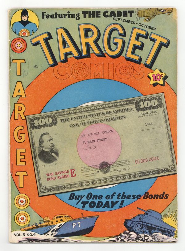 Tags: Anthology / CollectionPublished Oct 1944 by Novelty Press.$70.00Cadet story. Speck, Spot, and Sis story, script and art by Milt Hammer. Target story, art by Bill Allison. Candid Charlie, art by B. Gordon Guth. Patrol Torpedo text story. Dan'l Flannel humor story. Bull's-Eye Bill; still home on leave. Chameleon story, art by James Wilcox. Targettoons humor page by Milt Hammer. Full page sequential panel art ad for Tootsie Rolls, script by Rod Reed, art by C. C. Beck. 52 pgs. $0.10. Cover price $0.10.