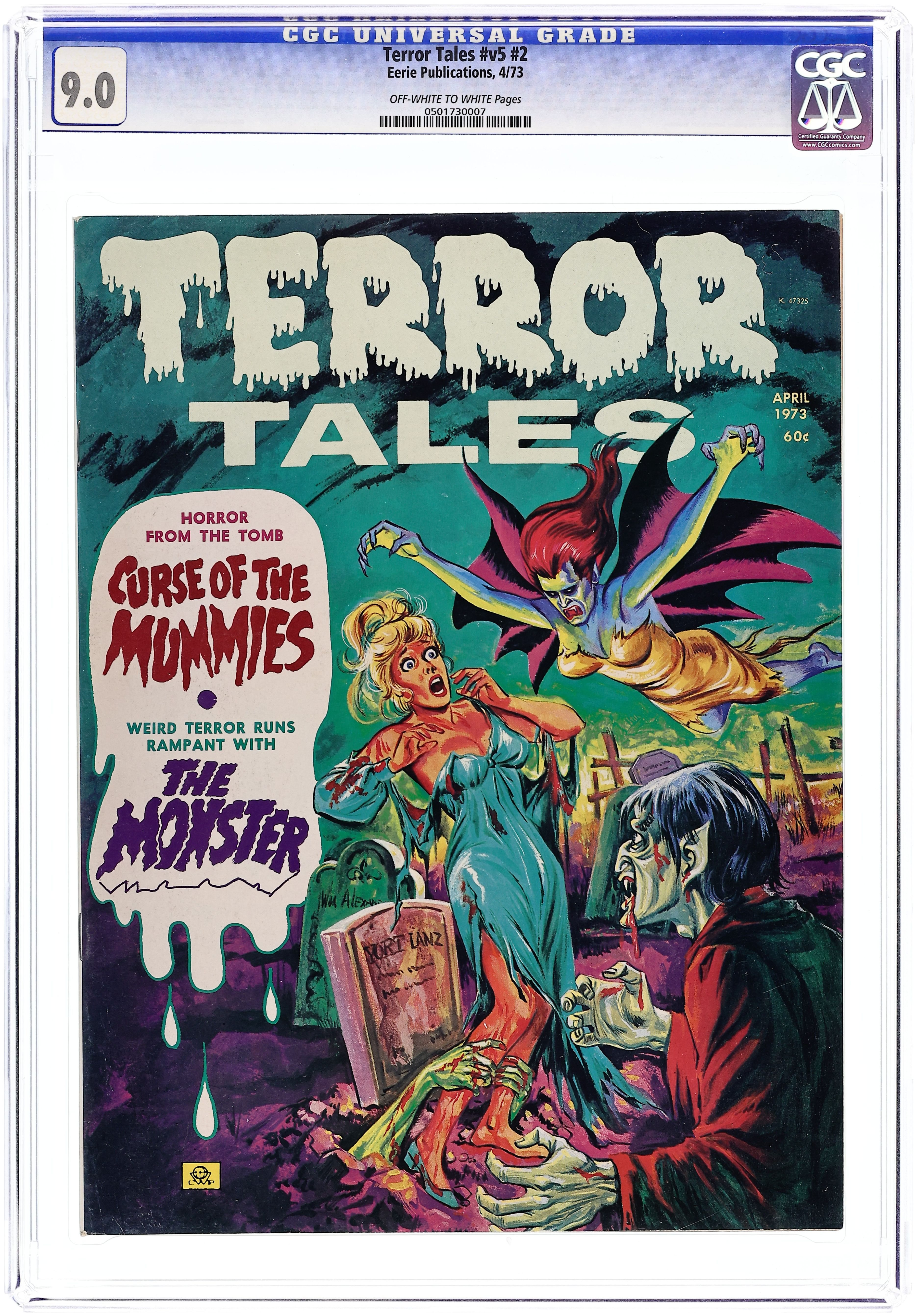 Cover by Bill Alexander. Stories and art by Walter Casadei, Antonio Reynoso, Larry Woromay, Oswal, and Dick Ayers. Legendary publisher Myron Fass presents gory tales of horror and the macabre. A thief who smuggles jewels in his glass eye witnesses a secret ceremony of the dead in Egypt. A young couple is taken captive aboard the ship of the damned called the Satana. A fortune hunter meets a beautiful woman while violating a sacred burial ground. Featuring altered reprints from Chamber of Chills and other 1950s pre-Code comics. Curse of the Mummies; The Monster; The Witches Coven; Tombstone for a Ghoul; Curse of the Vampire; The Moon Is Red. 8 1/2-in. x 11-in., 48 pages, B&W. Mature readers. Cover price $0.60.