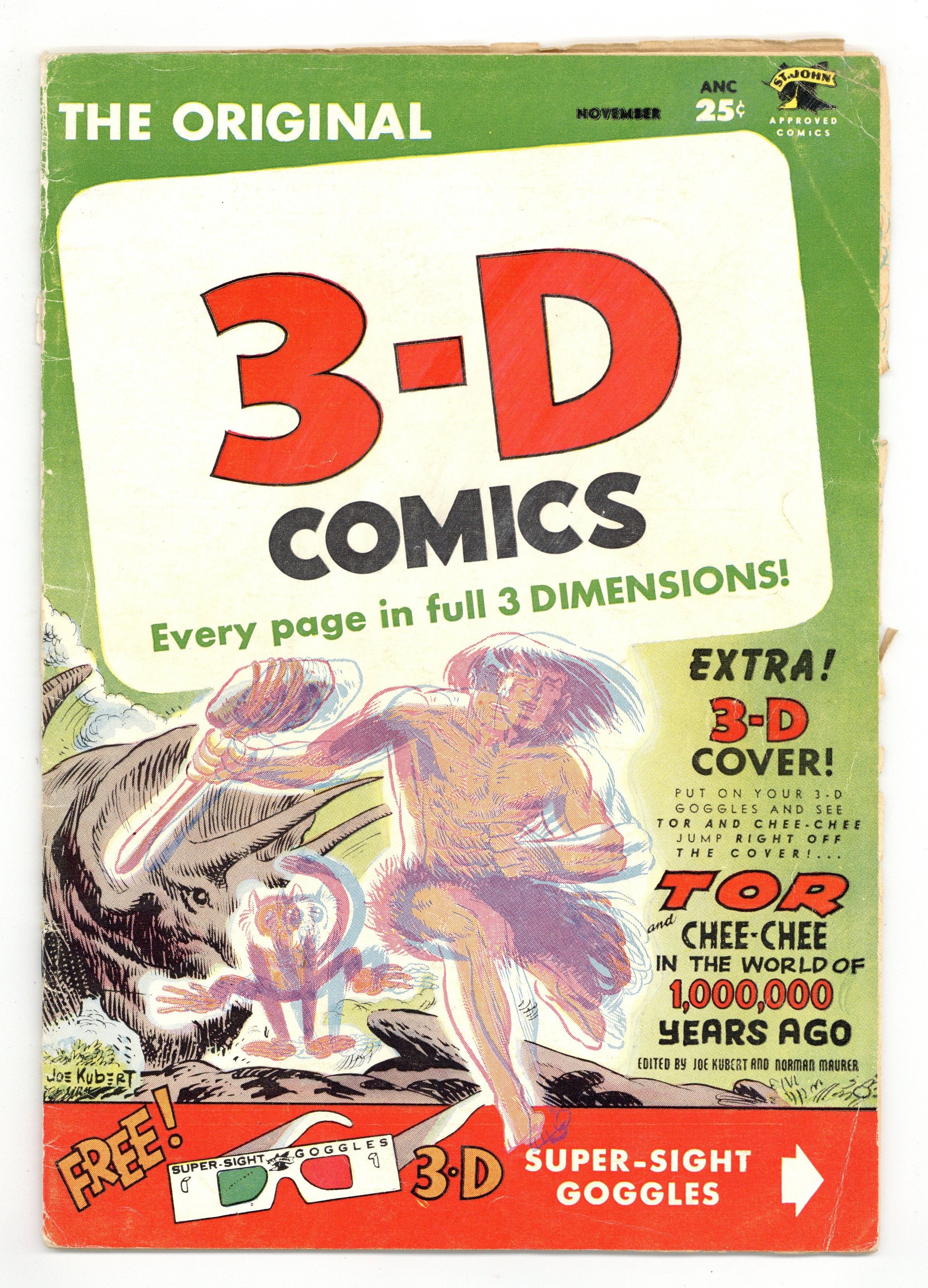 Cover by Joe Kubert. Stories and art by Joe Kubert and Norman Maurer. Numbering continues from One Million Years Ago (1953 St. John) #1. Comics legend Joe Kubert won fans early in his career with his tales of Tor, a caveman struggling for survival in a world where humans co-exist with dinosaurs. Kubert and St. John push the envelope with some of the earliest 3-D comics. Three versions of issue #2 exist; all are called Vol. 1 #2 in the indicia. This version has a 3-D cover, and contents entirely different from #2A and #2B. Bitter over a crippling injury, a member of Tor's tribe takes out his frustration on animals. Tor helps a tribe survive an attack by giants. Danny dreams himself into the past and helps cavemen invent the bow and arrow. Killer-Man; Stop! The Story of Evolution!: Horses, Elephant!; Danny Dreams; Giant-One; The Run Away. Final issue under this title; Tor's adventures continue in Tor (1954 St. John) In the World of 1,000,000 Years Ago #3. 32 pages, B&W with 3-D effects. Cover price $0.25.