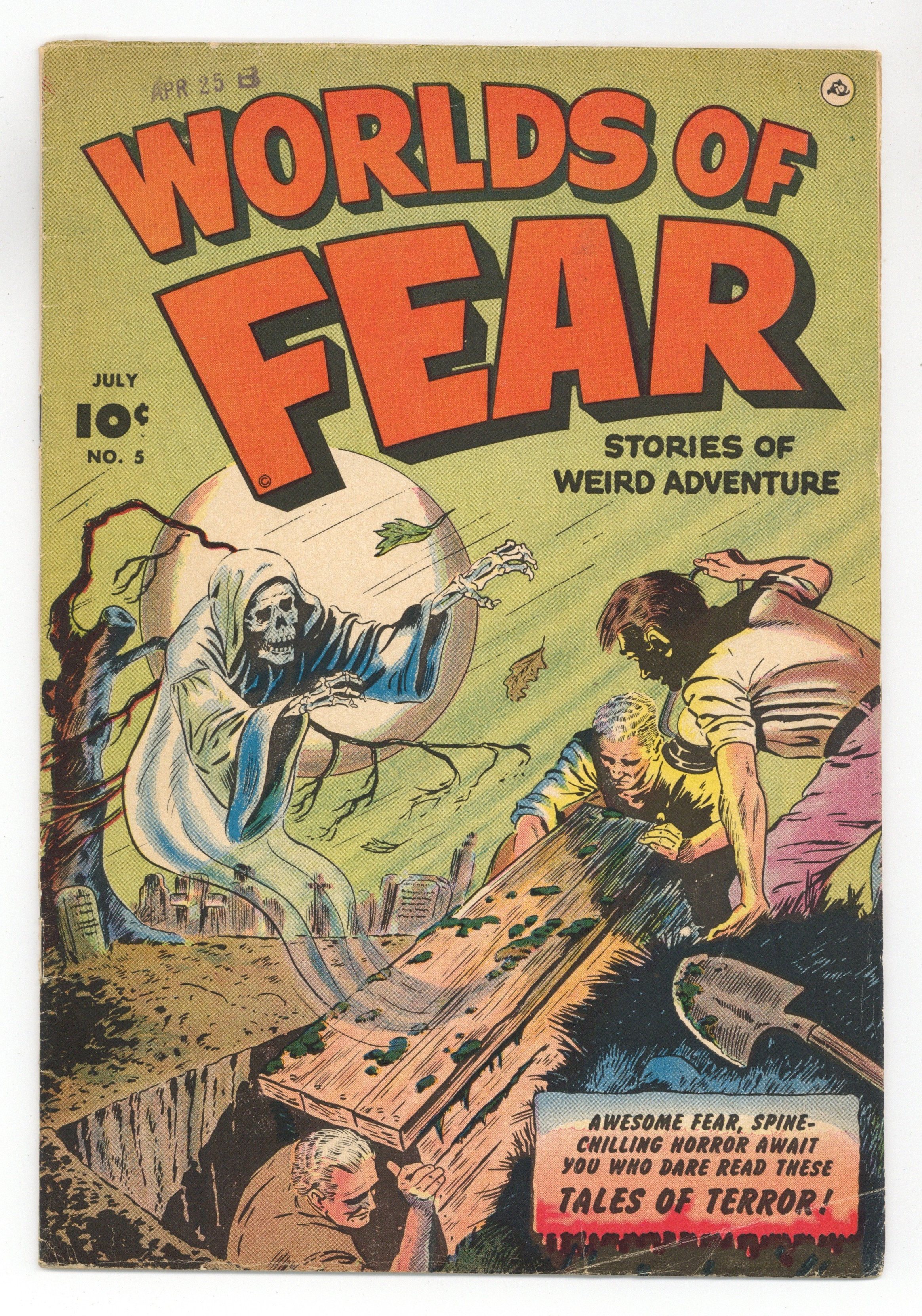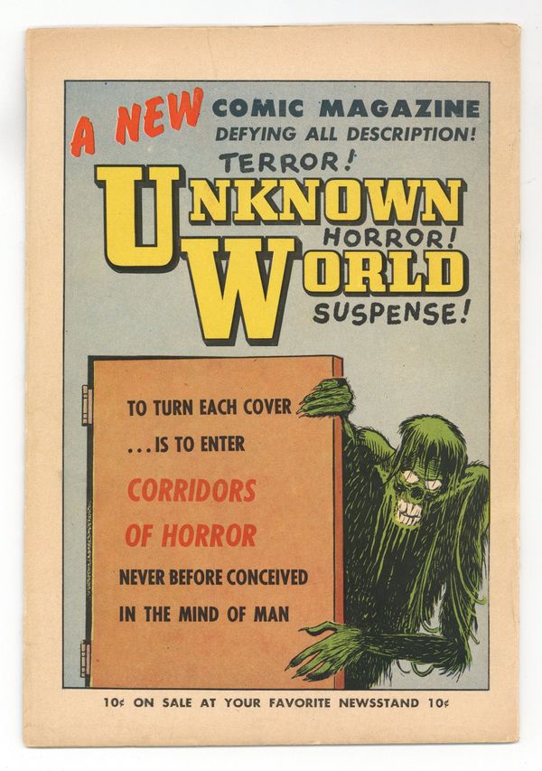 $295.00Cover by Sheldon Moldoff. Stories and art by Bob Powell, Eando Binder, Mo Marcus and Mike Sekowsky. Pre-Code tales of horror from Fawcett, a publisher not normally noted for grue. Con men plot the murder of eccentric clock collector Augustus, never guessing the secret behind all those clocks. A wooden puppet comes to life, but it's no friendly Pinocchio. A grave robber is haunted by vengeful worms. Heartbeat House; The Devil Puppet; The Horror in the Mirror; The Conqueror Worm. 32 pages, Full Color. Cover price $0.10.