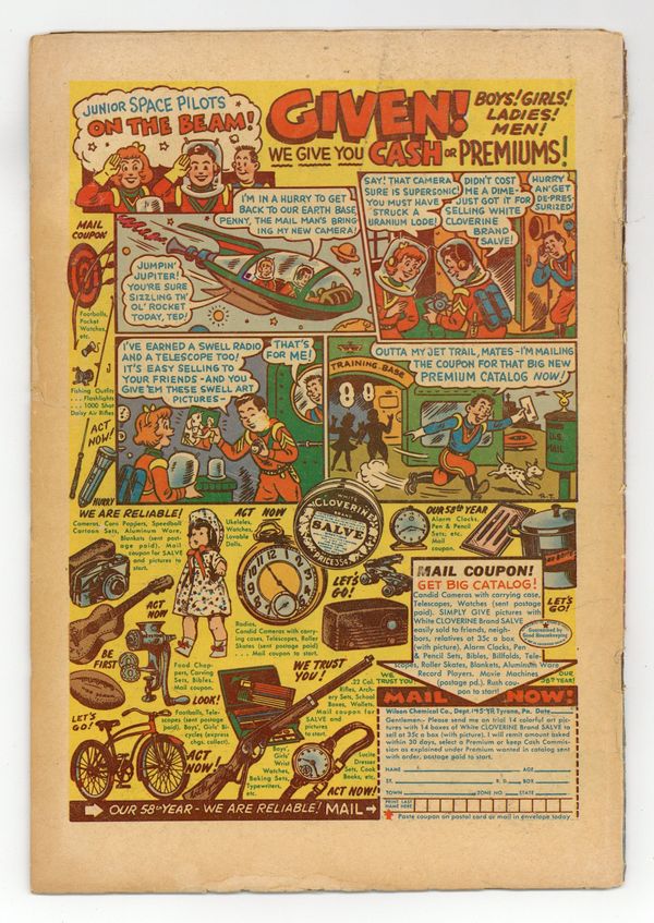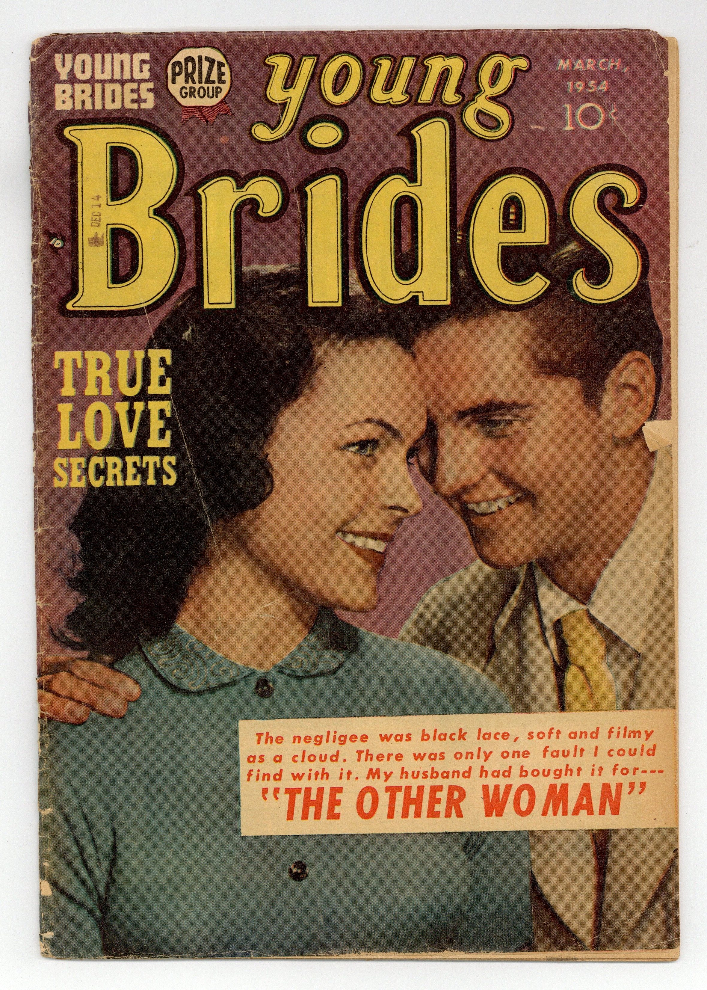 Volume 2, Issue 7. Whole number 13. Art by John Prentice, Bill Draut, and Bob McCarty Another spinoff of the Young Romance comics series, created and produced by Captain America creators Joe Simon and Jack Kirby. Fred flips out when he learns Ellen has been accepting "hand-me-down" (secondhand) clothing from the neighbors. Marcy freaks out when her husband buys a negligee that's not her size. Cass falls for Janet, but isn't prepared to take on her three children. The Bride Wore Hand-Me-Downs!; The Other Woman; Fashion Notes; Little Coquette!; Good Manners; Pulse, Please; Revenge with Kisses! 36 pages, full color. Cover price $0.10.