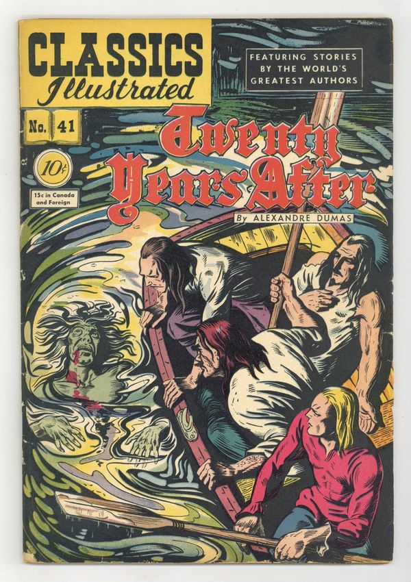 Twenty Years After (sequel to The Three Musketeers), 1st Printing, "Horror" Cover with the Three Musketeers in boat. (HRN 41, 9/47). Continues the adventures of D'artagnan and his three friends, Porthos, Athos, and Aramis during the hectic days of Queen Anne and Cardinal Mazarin. The story recreates one of the most turbulent periods in French history, marked by petty intrigues and beset with internal revolution. Cover price $0.10.
