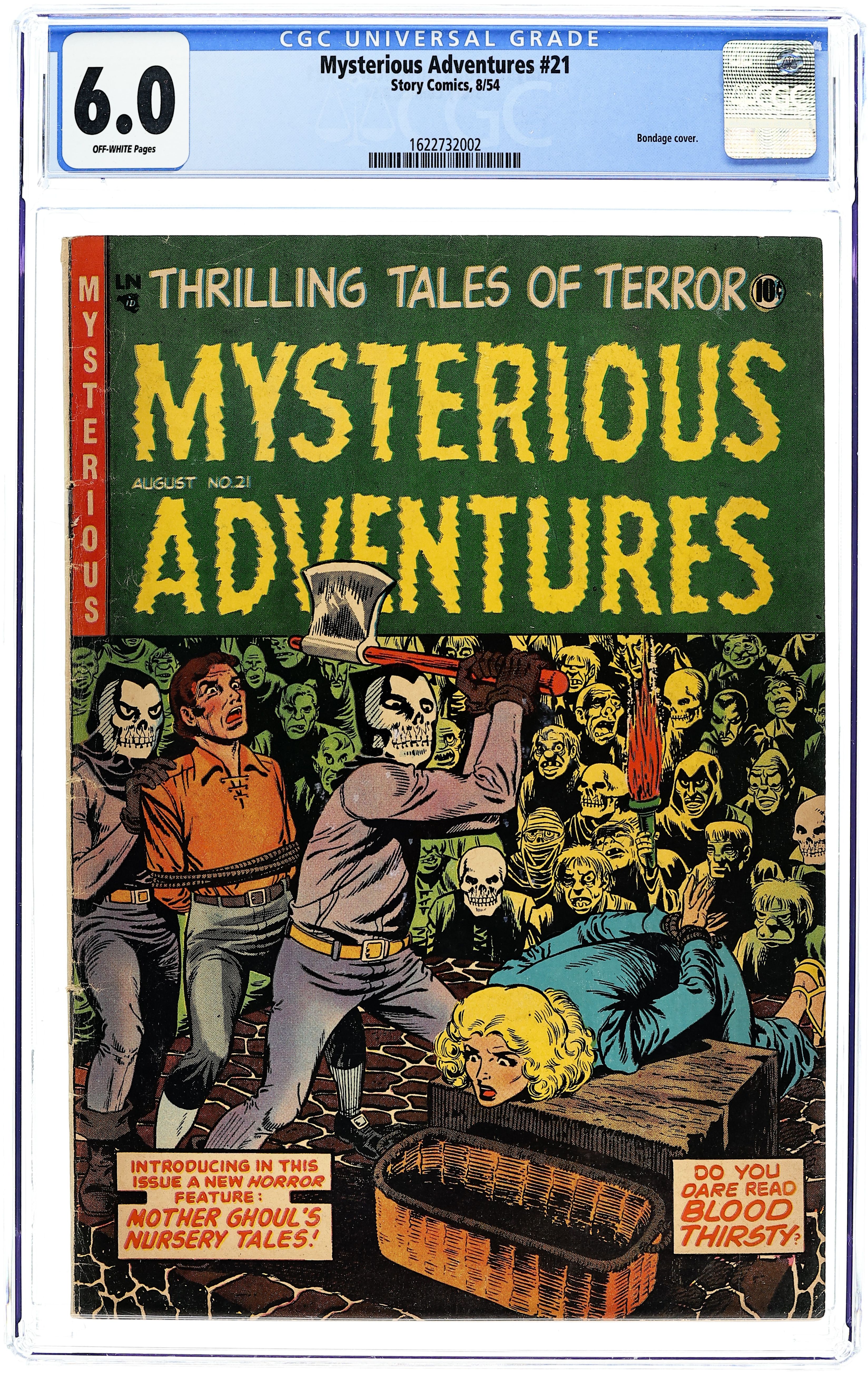 "The Choker," art by Ross Andru (?);A necklace has been in the husband's family for generations and takes revenge on the woman who killed him by strangling her and putting the blame on her boyfriend who hangs for her murder. "The Coward"; Butcher father breaks up son's engagement and son disembowels him in revenge in a very EC-esque tale. "Horror of the Guerrilla" text story by Ellen Lynn. "Beauty and the Beast" Mother Ghoul's Nursery Tale; Woman avoids the executioner by promising to bring the king the fortune of the Beast; She tries for months to get the beast to kiss her and turn into a prince, but he avoids her; She tries to kill him & fails. "Blood Thirsty"; Girl visits her grandmother and becomes convinced she is a vampire; Granny is incensed and insulted because she is really a ghoul and kills her granddaughter in fit of pique. 36 pgs., full color. Cover price $0.10.