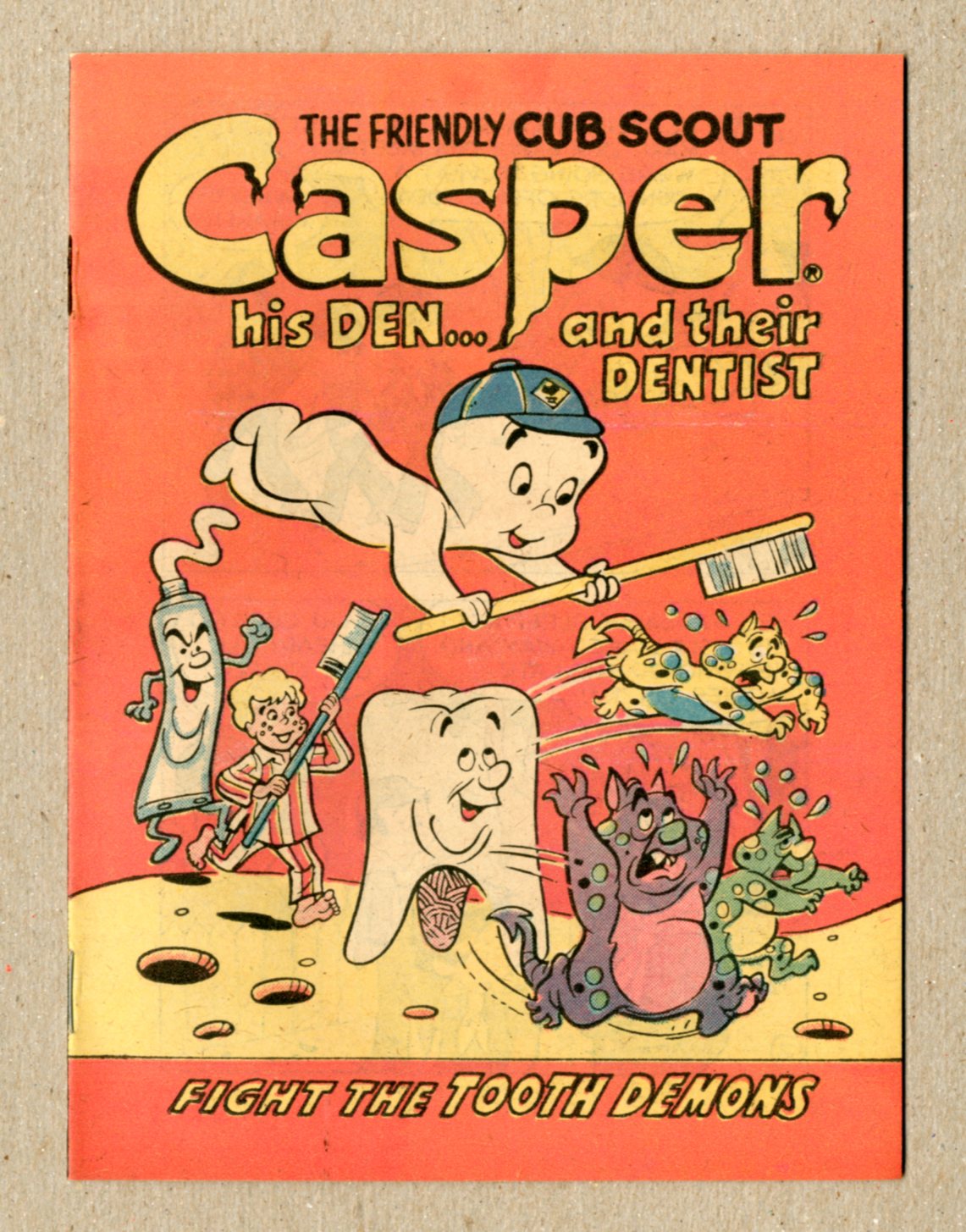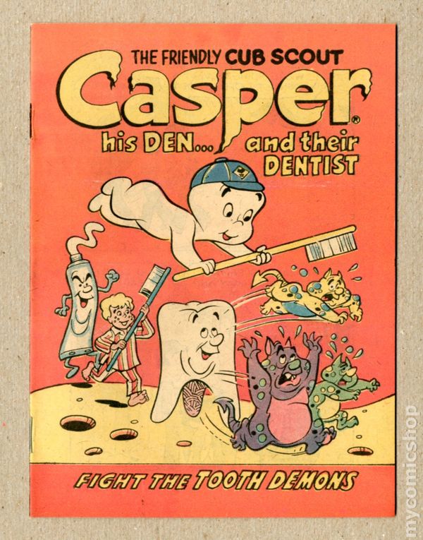 Casper the Friendly Ghost, His Den, & Their Dentist Fight the Tooth Demons is a promotional comic/dental health PSA published by Harvey Comics for the American Dental Association, promoting dental health for Cub Scouts and other young readers. When the Tooth Demons arrive to threaten enamel and gum alike, Casper and his Cub Scout troop (or "den") fight back with proper dental hygiene. 5-in. x 7-in. 16 pages, Full Color.