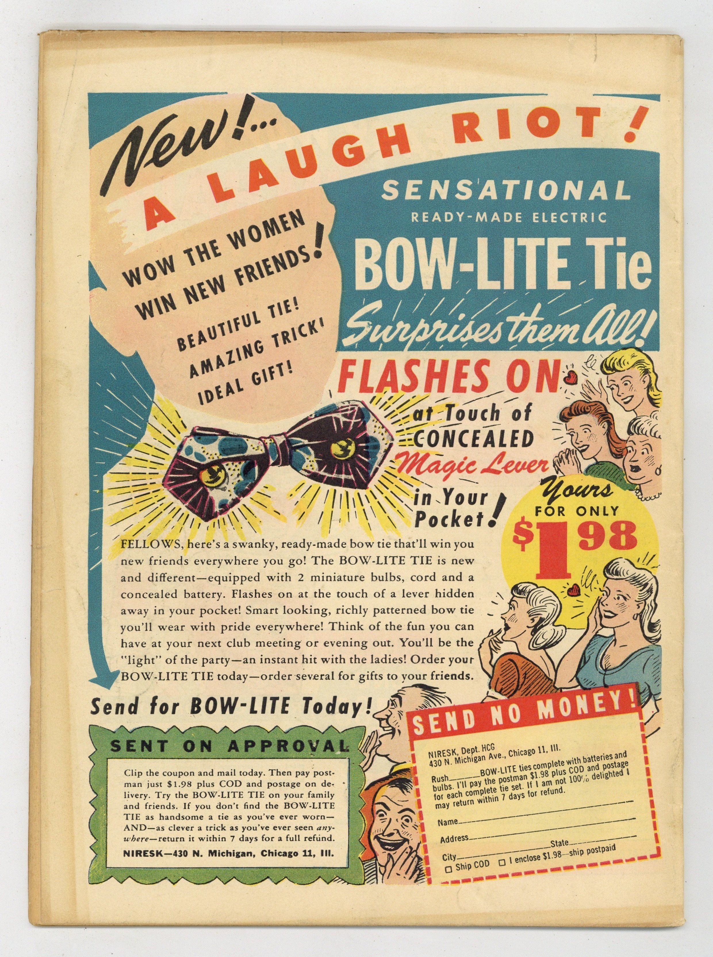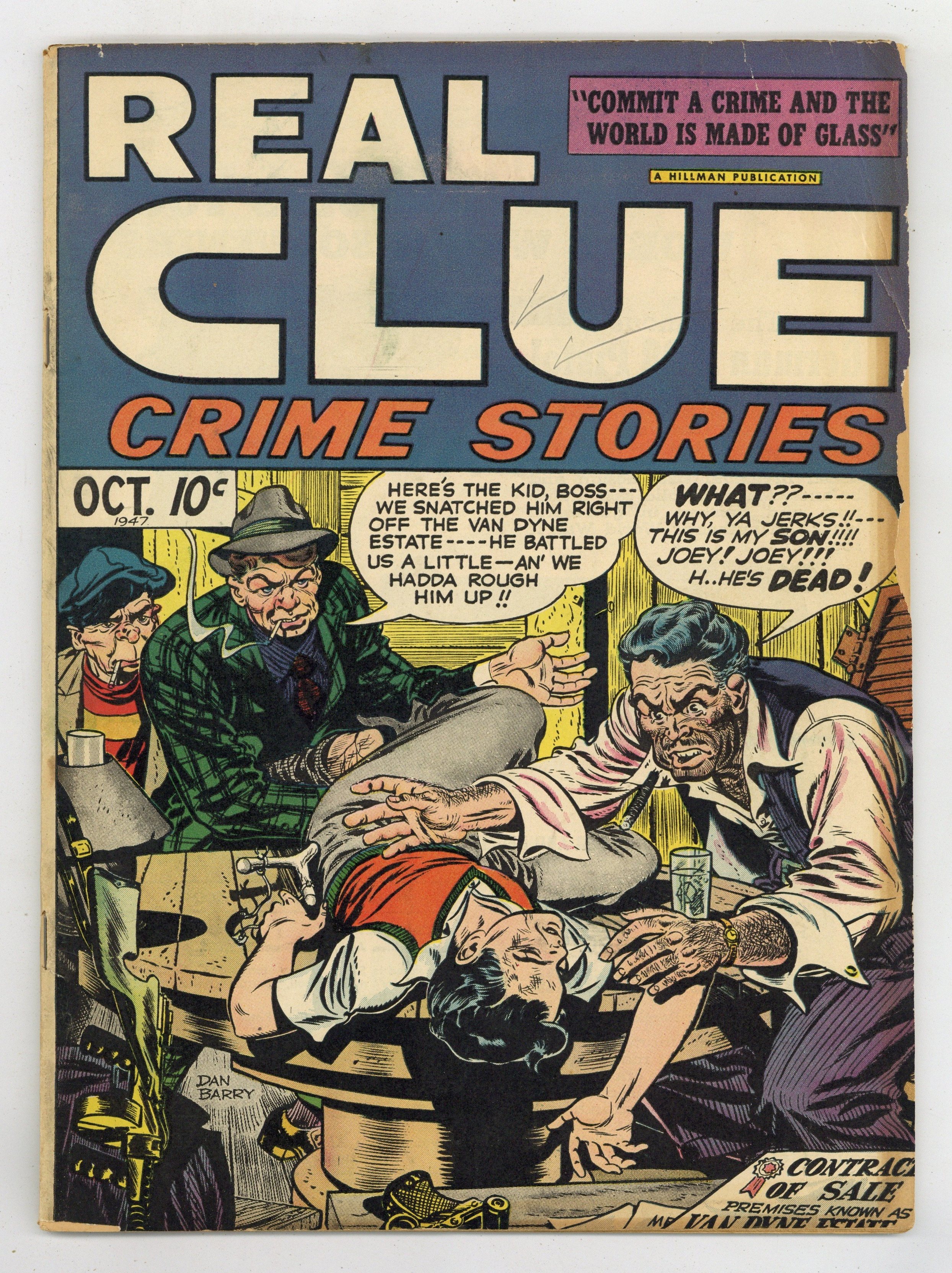 $90.00Cover by Dan Barry. Art by Bob Fujitani, Dan Barry, Art Helfant, Bernard Sachs and Carmine Infantino. Another crime comic from the prolific studio of Joe Simon and Jack Kirby, this one featuring crimes throughout history as well as the standard gangster tales. Sometimes listed as Real Clue Crime #20. No issue # on cover; Vol. 2, issue #8 in indicia. A jolly crimelord commits one kidnapping too many. Actor "Johnny" Booth plans the highest of crimes in 1865 Washington DC. Stories with early art by Carmine Infantino and future Flash Gordon artist Dan Barry. Also featuring a vintage ad for reproduction WWII pistols - "German P-38 and Italian 7.65 Brevettata" - for only $1.25 each. Last Laugh For Willie; The Mark Of Akron; America's Most Heinous Crime; You Can't Split Murder; The Tell-Tale Ear; French Death In Grey Gloves; La Savate; Fetlock Groans the Detective; Baron Buckskin. 48 pages, Full Color. Cover price $0.10.