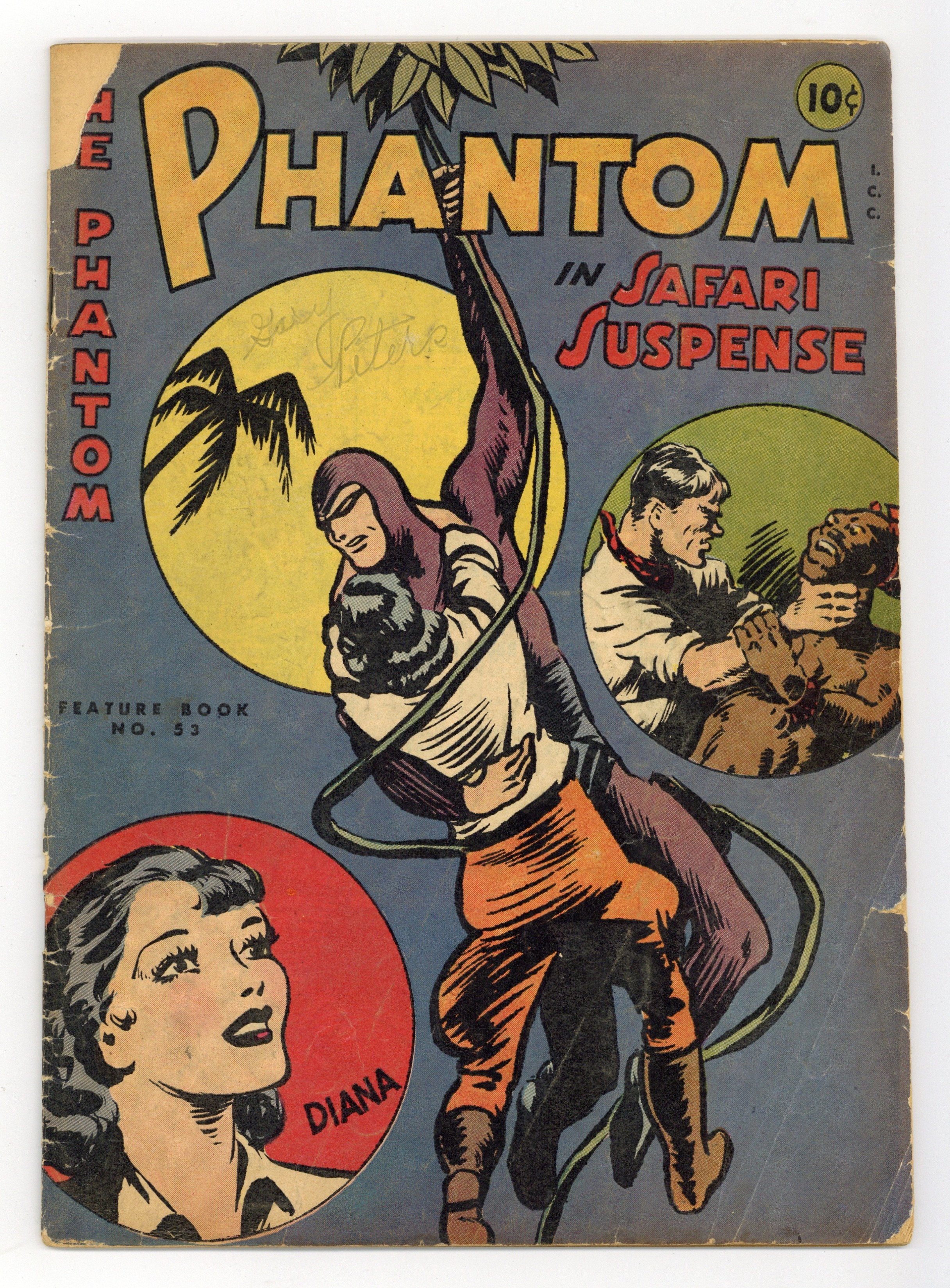 The Diamond Hunters. Story by Lee Falk. Art and cover by Ray Moore. Pioneering comics publisher David McKay's Feature Book was the first US comic book to devote complete issues to a single character. These issues, reprinting classic Phantom comic strips from the 1930s, were the first official Phantom comic books. Reprints The Phantom daily pages from April 12th to September 18th, 1937. The Phantom brings Diana to his jungle home for the first time, only to discover that war has broken out between neighboring tribes. The culprits are unscrupulous diamond hunters who are trying to take advantage of the chaos to steal a fortune. 36 pages, Full Color. Cover price $0.10.