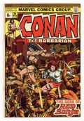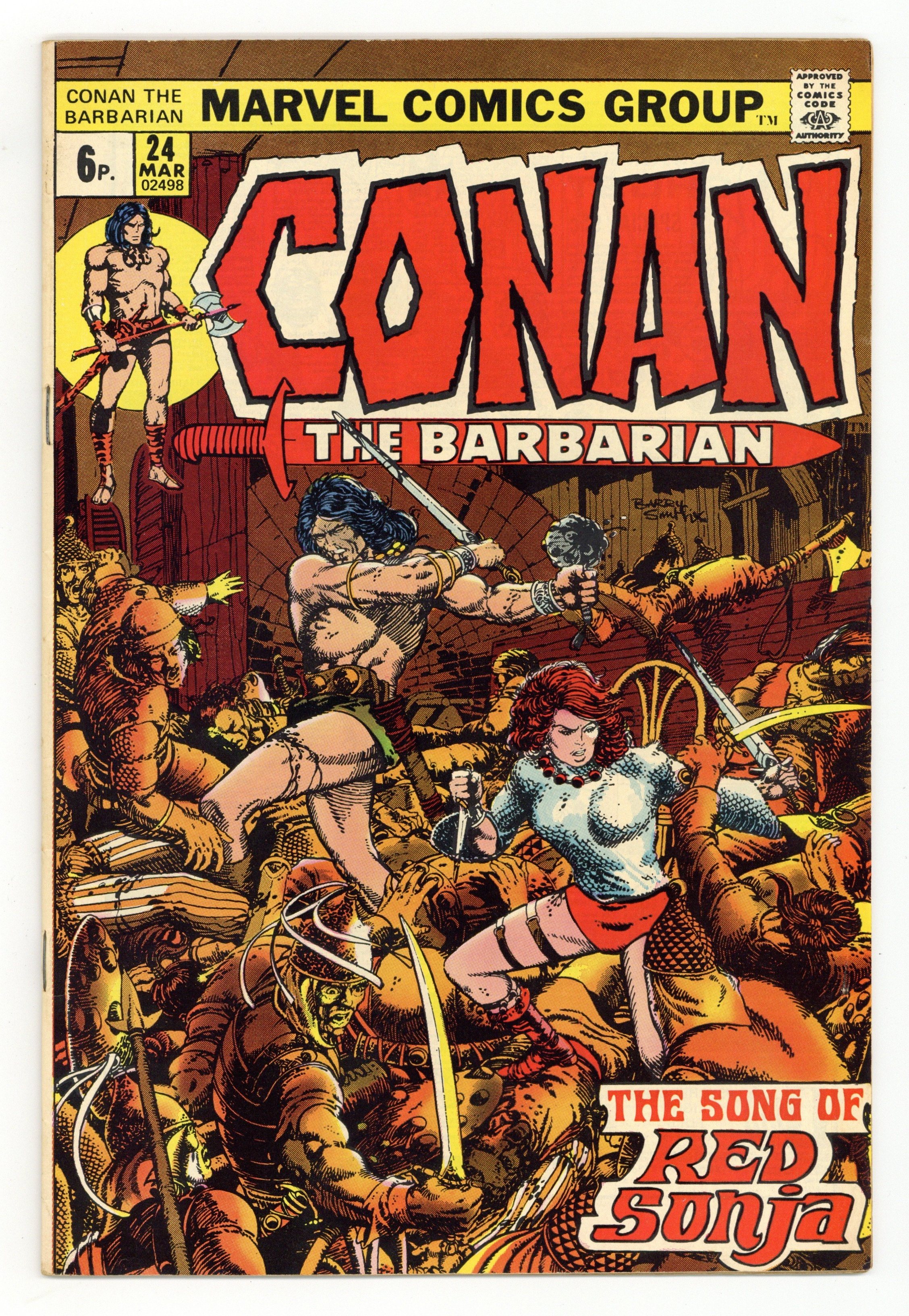 UK edition. Identical to US edition, but has 6p cover price. Cover art by Barry Windsor-Smith. First full Red Sonja story, The Song of Red Sonja, script by Roy Thomas, pencils by Barry Windsor-Smith; setting:Makkalet; Conan and Red Sonja start a bar-fight, bathe in a fountain, scale temple walls, break in and steal a snake-tiara, and fight a magical snake; at the end Sonja tricks Conan, and leaves for Pah-Disha; the Red Sonja story continues in Savage Sword of Conan 1. Final Windsor-Smith art on this title. The art in this issue (at least on page 8, and perhaps elsewhere) was altered without Windsor-Smith's approval. See Marvel Treasury Edition 15 or Savage Sword of Conan 82 for the original version. (The reprint in Conan Saga 8 contains the altered version). In the letters column, Roy Thomas responds and announces Barry Smith's final departure as Conan the Barbarian artist; Incidentally, Roy's responses to R. Benitz and Keith Taylor are mistakenly transposed.32 pgs.