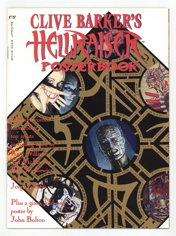 Does your life seem too peaceful lately? Then give yourself a good scare with this collection of the most nightmarish sights from Epic's Hellraiser comic! Each pinup is perforated for easy removal, and as a bonus there's a giant, 16-page fold-out of Pinhead by John Bolton! Art by Kent Williams, Ted McKeever, Bill Sienkiewicz, Jorge Zaffino, Simon Bisley, Daniel Brereton, Mike Mignola, Mark Chiarello, Kevin O'Neill and more. Cover price $4.95.