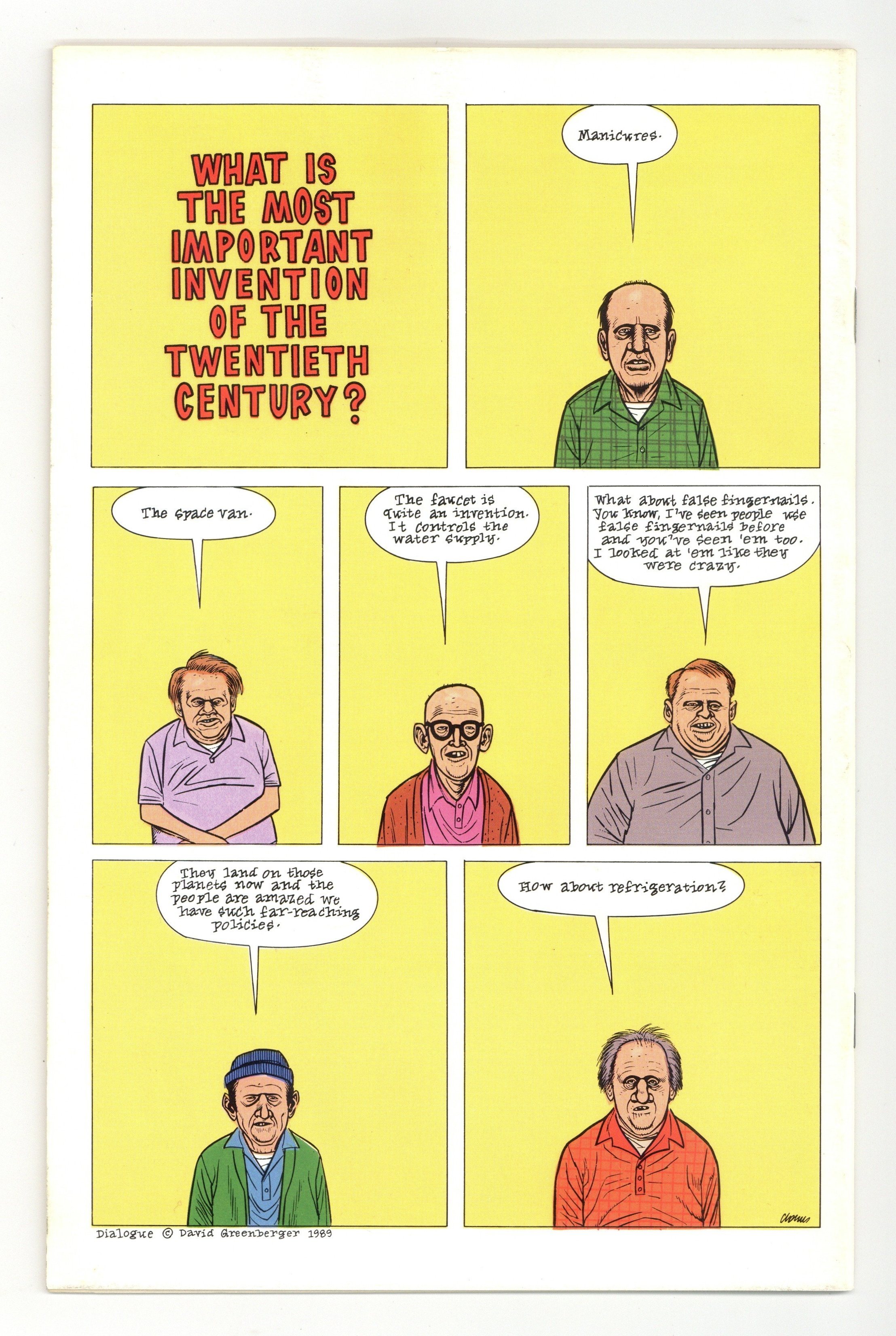 Cover art by Daniel Clowes. Like a Velvet Glove Cast in Iron; Clay sees a strange and compelling film titled 'Like A Velvet Glove Cast In Iron' and attempts to discover more about it. The Laffin' Spittin' Man; Lloyd's philandering has unforseen consequences. Young Dan Pussey; Satire about monthly mass-produced super-hero comics. Scripts and art by Daniel Clowes. 36 pgs. $2.00. Cover price $2.00.