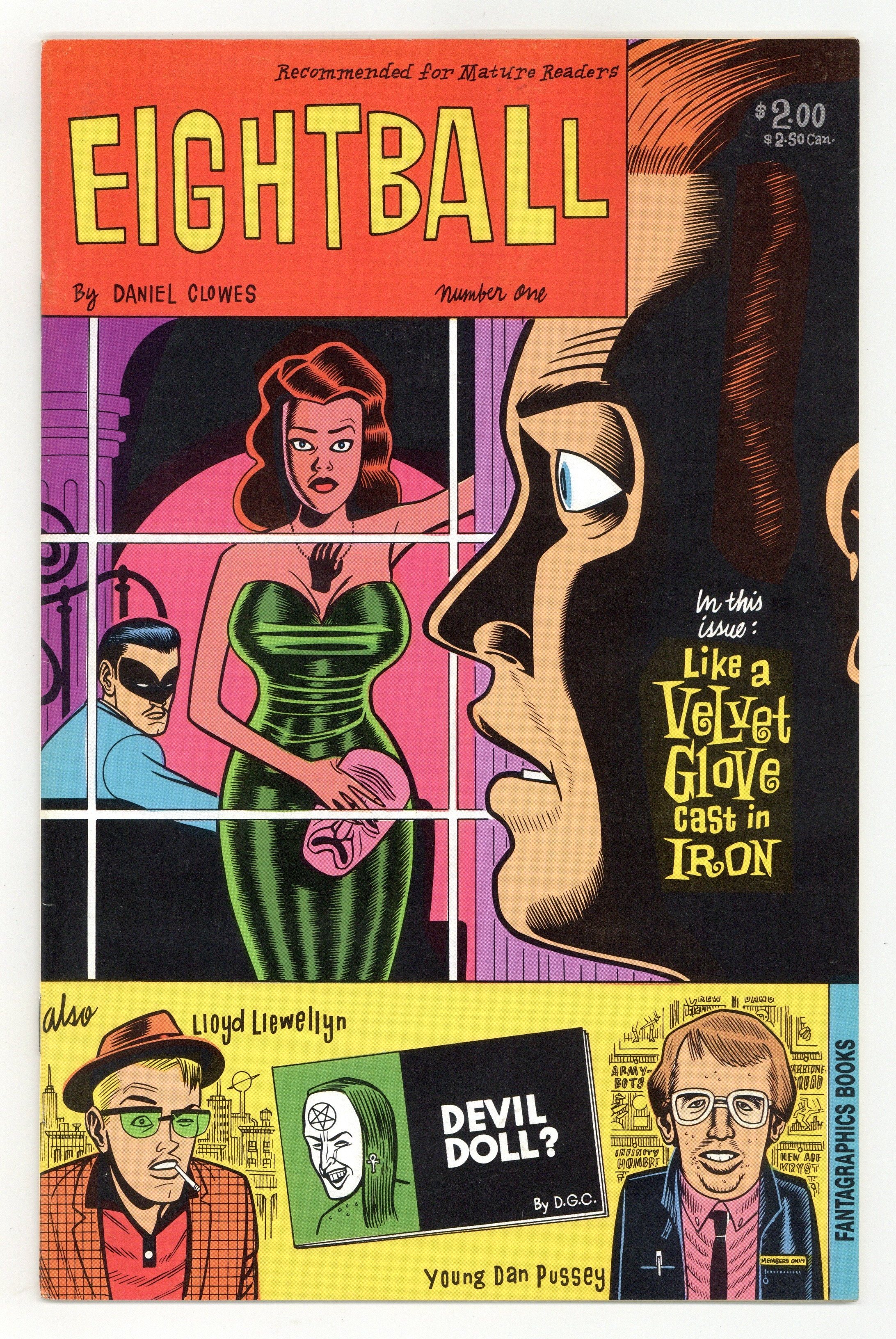 Published Aug 1989 by Fantagraphics.$80.00Cover art by Daniel Clowes. Like a Velvet Glove Cast in Iron; Clay sees a strange and compelling film titled 'Like A Velvet Glove Cast In Iron' and attempts to discover more about it. The Laffin' Spittin' Man; Lloyd's philandering has unforseen consequences. Young Dan Pussey; Satire about monthly mass-produced super-hero comics. Scripts and art by Daniel Clowes. 36 pgs. $2.00. Cover price $2.00.