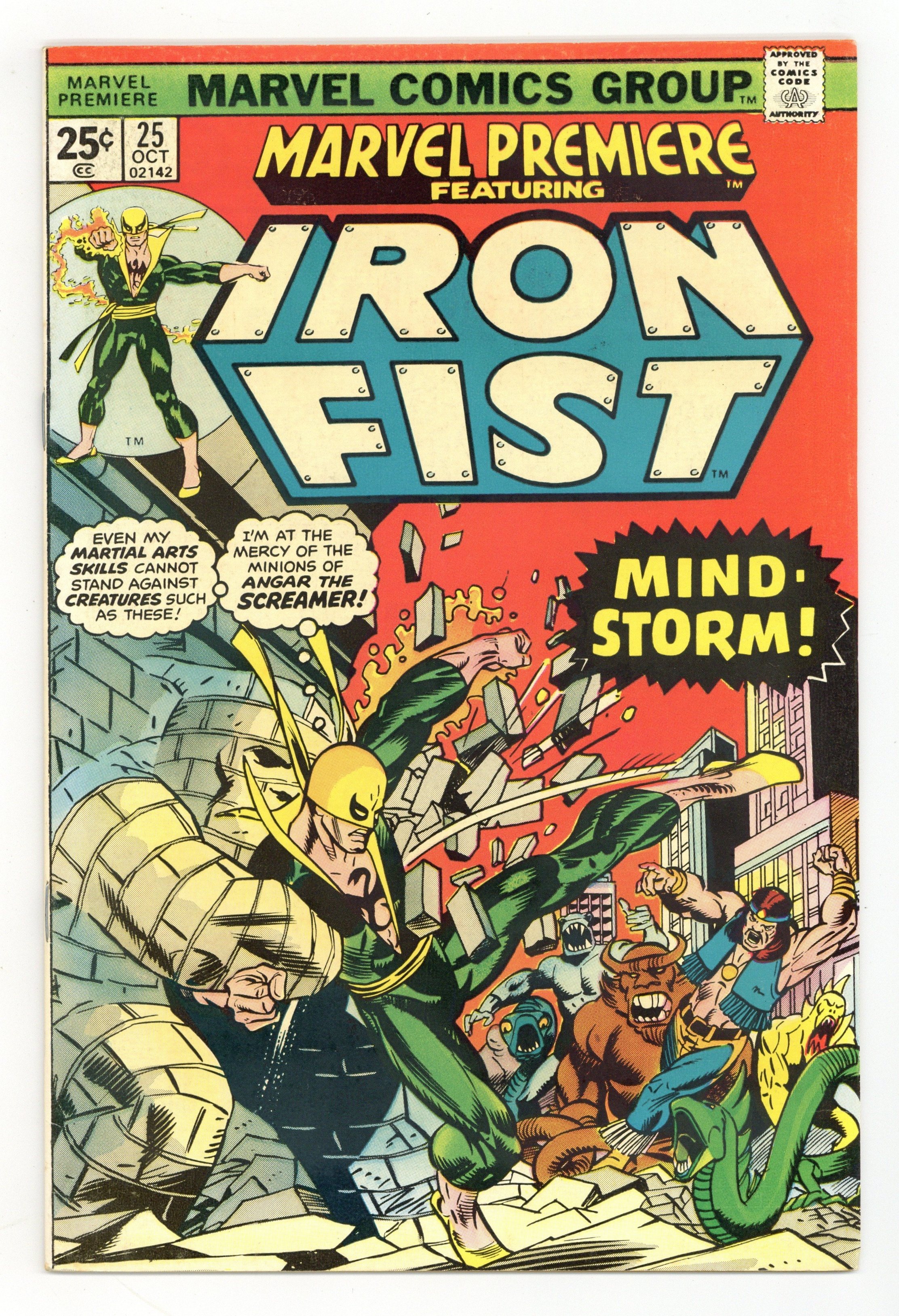 Cover pencils by Gil Kane, inks by Dan Adkins. Morning of the Mindstorm!, script by Chris Claremont, pencils by John Byrne, inks by Al McWilliams; Iron Fist arrives at the Wings to discover Colleen missing and Lee raving like a mad man; Danny and Scarfe try to track down Colleen but are assaulted by illusions courtesy of Angar; Beating Angar down, Iron Fist discovers a Stark International i.d. card on the villain and figures the company is behind the disappearance of his friend. Continued in Iron Fist (Marvel, 1975 series) #1. The letters page contains Marvel Value Stamp series A # 6 (Thor by John Buscema). 36 pgs. $0.25. Cover price $0.25.