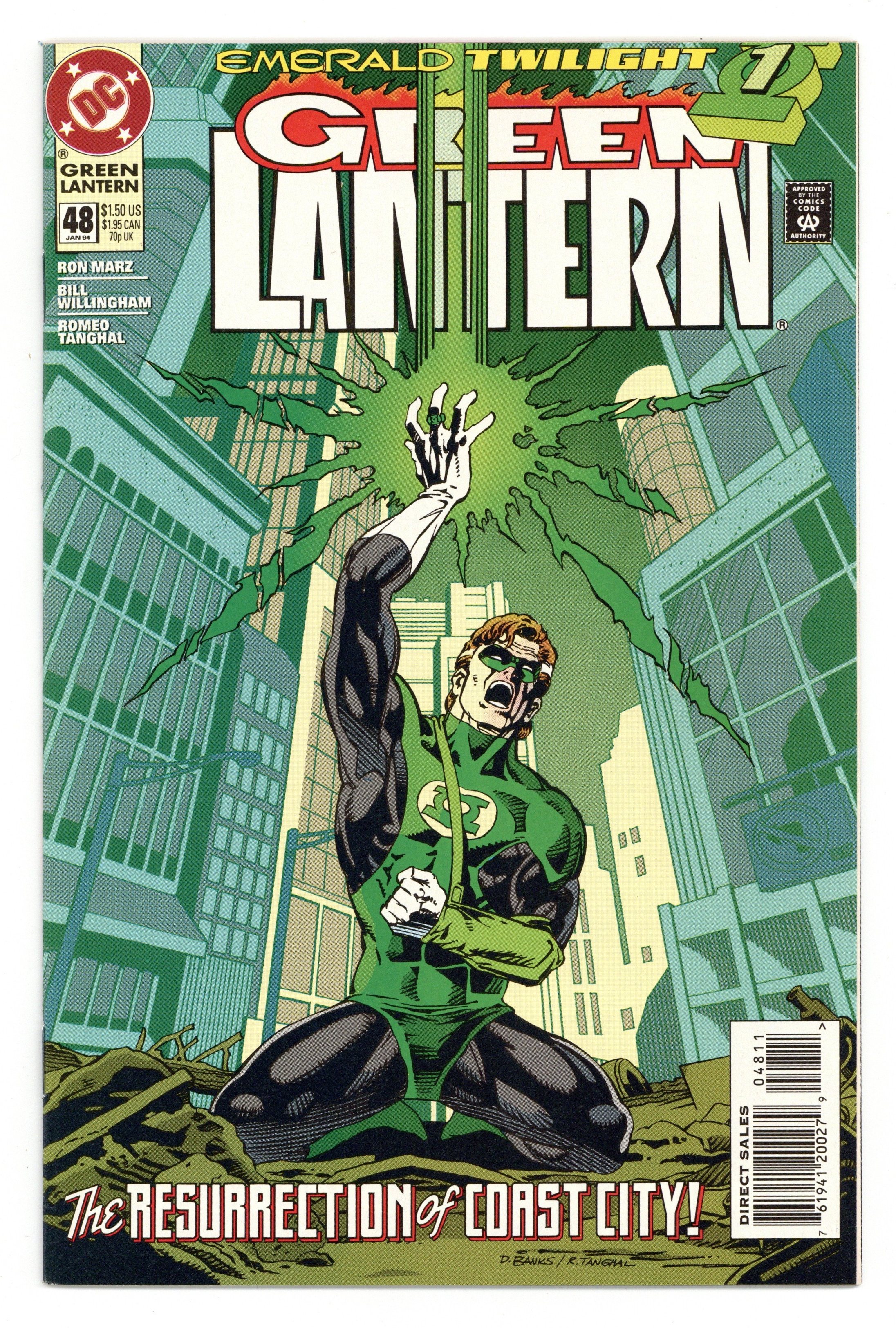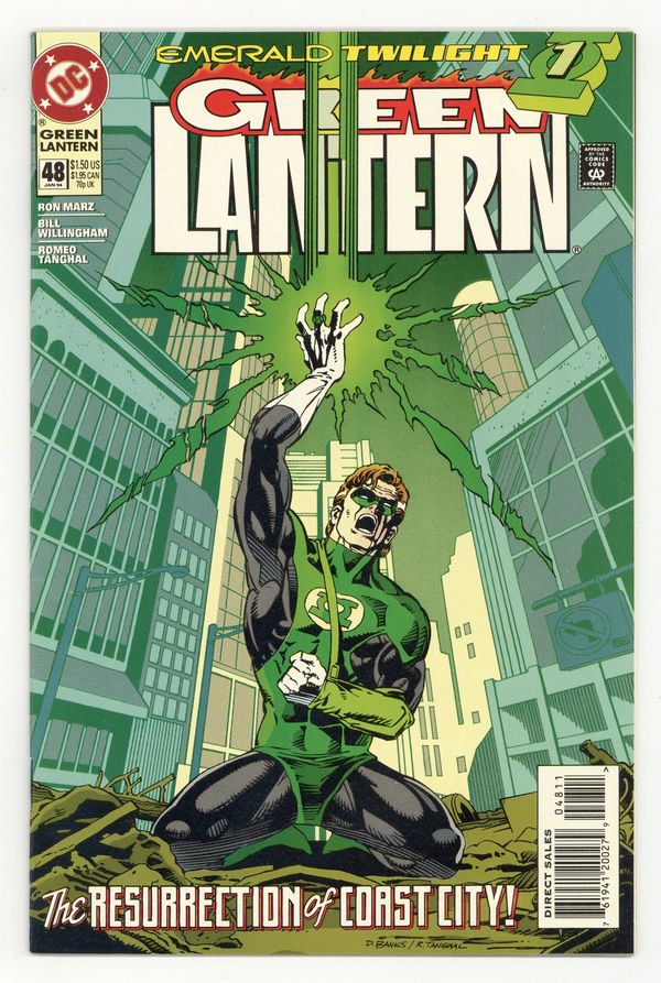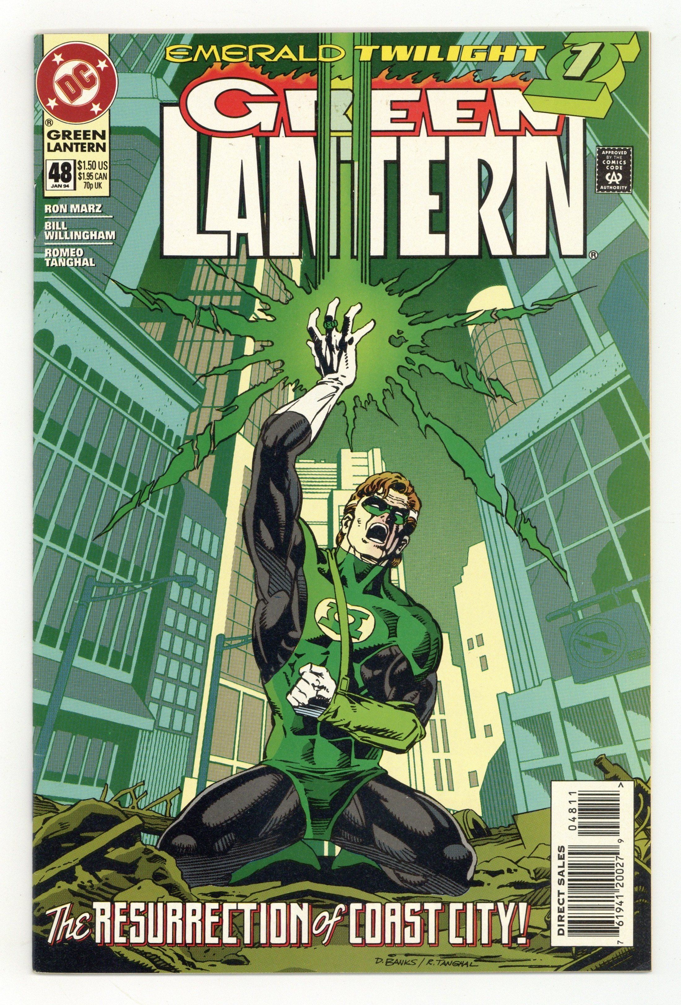 Starts Apr 4 Direct Edition. Emerald Twilight: Part 1 of 3. "The Past!" Story by Ron Marz. Art by Bill Willingham, Robert Campanella, and Romeo Tanghal. It's the beginning of the end for Hal Jordan. In this seminal chapter in the life of Green Lantern, Hal returns to ground zero and attempts to use his Power Ring to resurrect the devastated Coast City. But what happens if he doesn't have enough power? Don't miss the most unexpected turn in the life of Hal Jordan as DC counts down to a very special 50th issue. NOTE: 1st appearance of Kyle Rayner. Cover price $1.50.