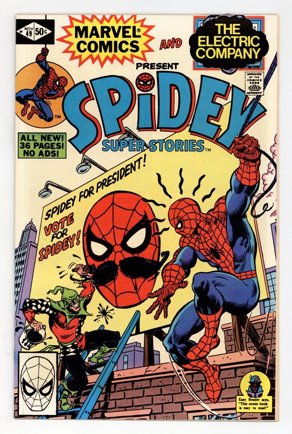 "Spidey for President!" Story by Jim Salicrup and Steve Grant. Art by Winslow Mortimer, Ricardo Villamonte, and Mike Esposito. Spidey gets baffled by the Jester. Includes the 1-page features "All about the Rocket Racer," "Who is Hawkeye?,"and "Wit of the Webslinger." Includes the back-up tale "Fargo's Problem!" Guest-starring the cast of the Electric Company. Plus, Spidey and Hawkeye star in "The Rocket Racer!" Featuring the clip and collect Spidey Stamp: #33 The Rocket Racer. Cover price $0.50.