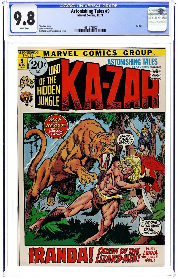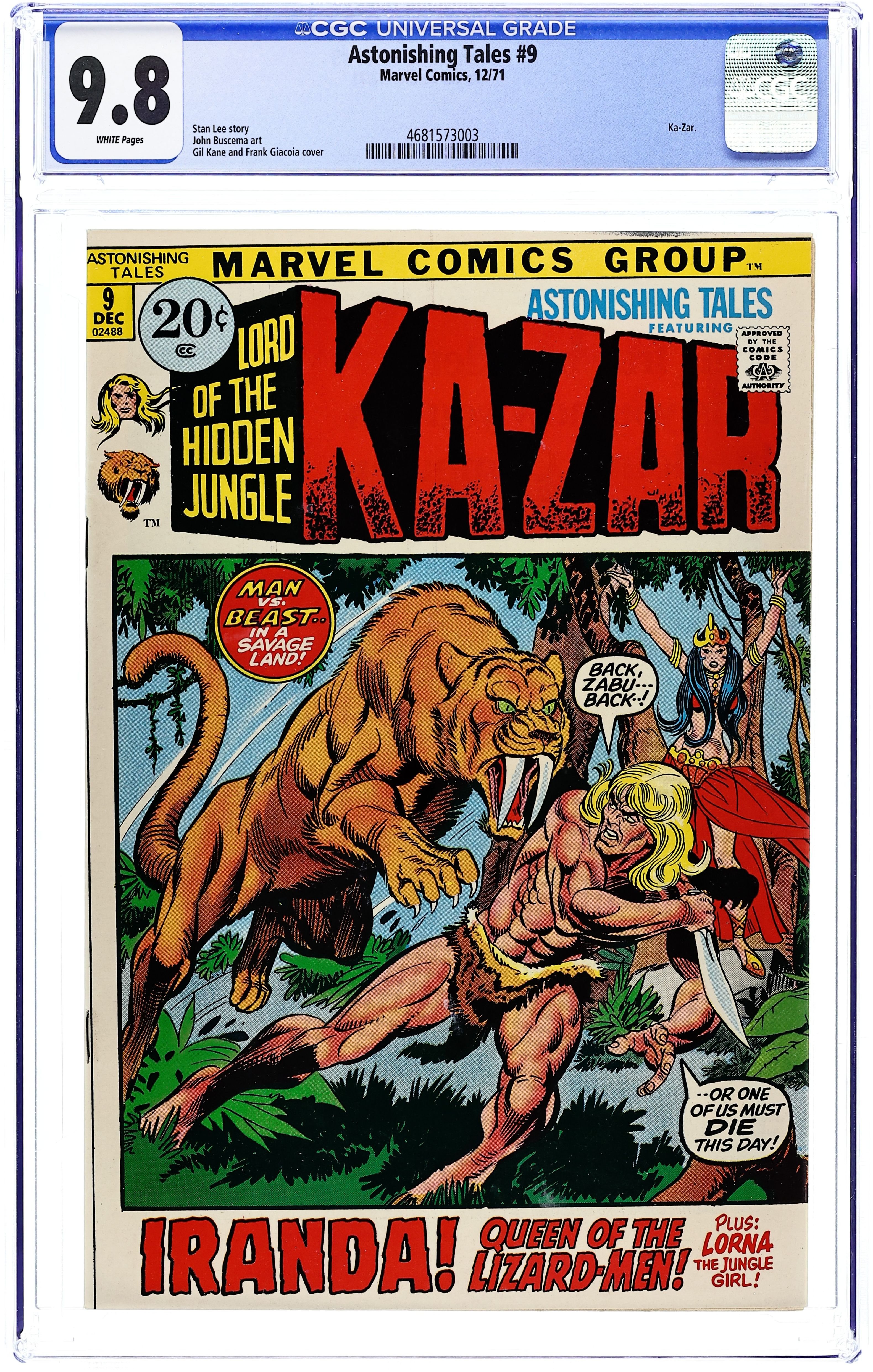First 20-cent cover price. Cover pencils by Gil Kane, inks by Frank Giacoia. The Legend of the Lizard Men!, script by Stan Lee, art by John Buscema; When Ka-Zar goes in search of missing women and men from a local village, he finds the woman, Iranda and the Lizard Men. Tom-Toms of Danger!, script by Don Rico, art by Jay Scott Pike; Moki uses the sound of Tom-Tom's to drive all of the Gabu into a war frenzy so that he can take over the jungle. The Green Opal! starring Lorna, the Jungle Girl, script by Don Rico, art by Jay Scott Pike; Alexei and Subu surrender when The Green Opal warns them that if they dont stop abusing its name and power it will pursue them to the ends of the earth. Cover price $0.20.