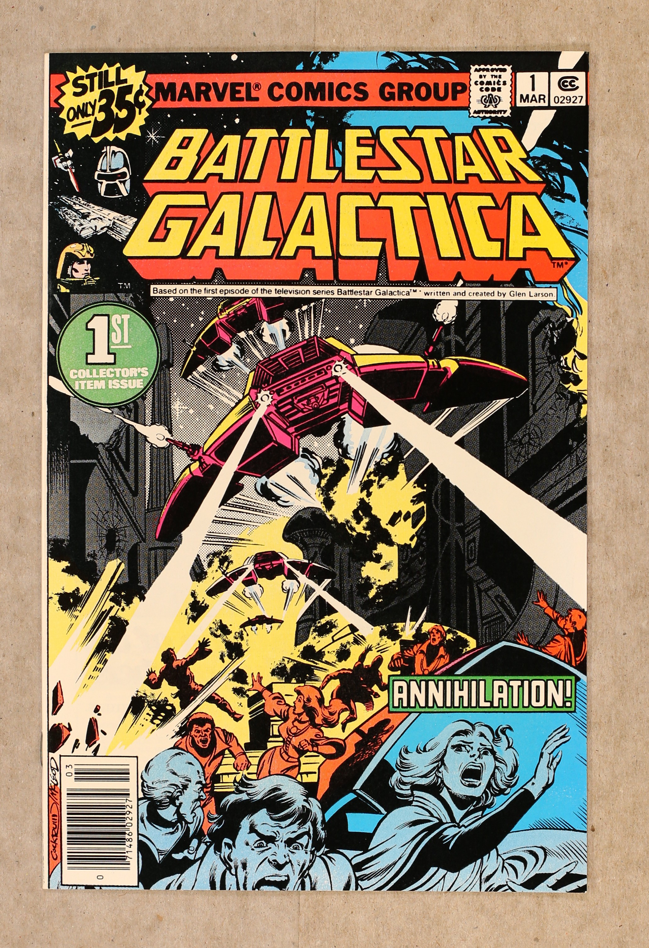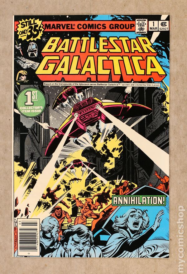 $10.00"Battlestar Galactica!" Based on the episode written by Glen Larson. Adapted by Roger McKenzie. Art by Ernie Colon. Cover by Dave Cockrum and Bob McLeod. In a distant time and place, a terrible war was waged between man and machine...the humans lost. Now, guided by their last surviving warship - the mighty Battlestar Galactica - a handful of survivors travel through space in search of the lost home of their ancestors, a shining planet known through ancient records, a planet called Earth. Cover price $0.35.
