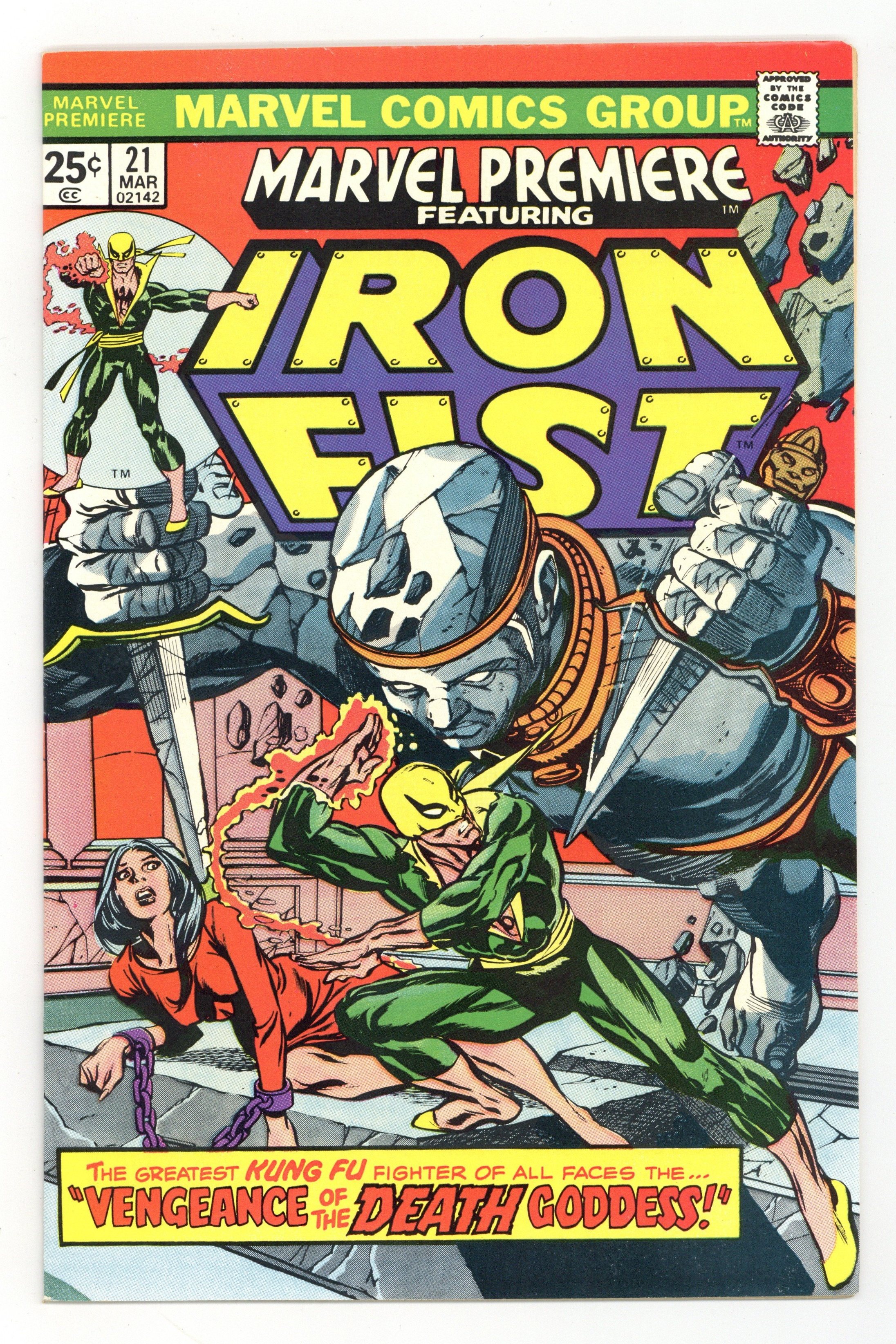 Cover pencils by Gil Kane, inks by Tom Palmer. Daughters of the Death-Goddess, script by Tony Isabella, pencils by Arvell Jones, inks by Vince Colletta; Batroc becomes enraged when the Meachums refuse to pay him for failing to kill Iron Fist; Iron Fist arrives at the Wings to find dead cult members lying in rubble but no sign of his friends; Misty Knight arrives and attacks Danny whom she suspects has done something with Colleen; Iron Fist follows the Ninja to the underground Temple of Kali where he finds Lee and Colleen in chains; He battles the daughters of Kali, but the Sacred Volume of Kali is burned up in the conflict; This enrages the Ninja who splits off from Lee Wing whom he has been possessing and prepares to kill Iron Fist; Brief appearance by Batroc. 36 pgs. $0.25. Cover price $0.25.
