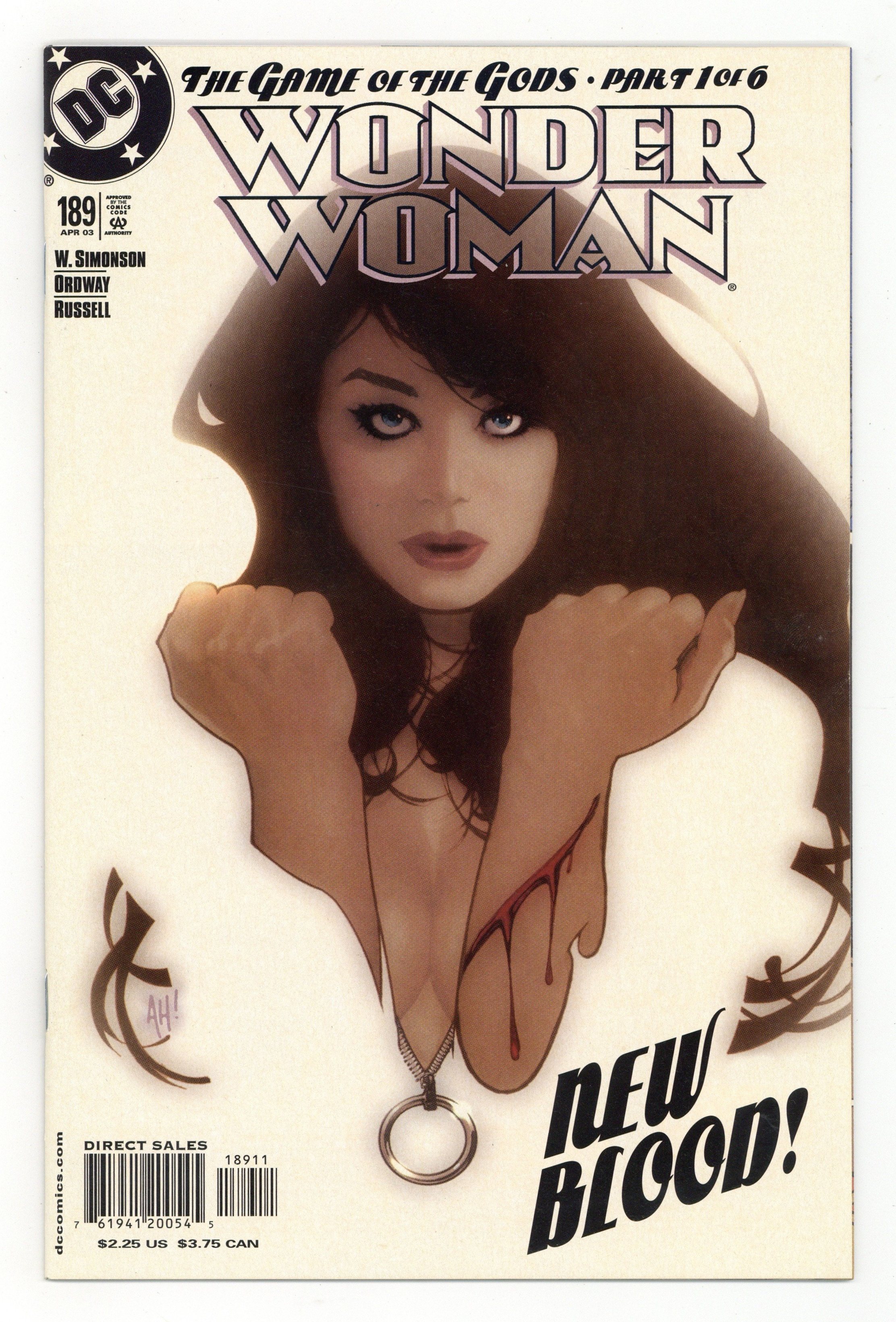Game of the Gods, Pt. 1 of 6. WRITTEN BY WALTER SIMONSON; ART BY JERRY ORDWAY AND P. CRAIG RUSSELL: COVER BY ADAM HUGHES Walter Simonson, Jerry Ordway and P. Craig Russell join cover artist Adam Hughes for an incredible 6-part adventure! Wonder Woman has vanished without a trace. Bereft of her memories, deprived of her gods-given abilities, and without her familiar costume, lasso and bracelets, Diana must fight off a horde of monstrous foes and find her way back to Earth from the Cryptocombs? the Cemetery of the Gods? all the while protecting a mysterious clay statue of a baby girl. For more information, see the feature article. FC, 36 PG.$2.25 Cover price $2.25.