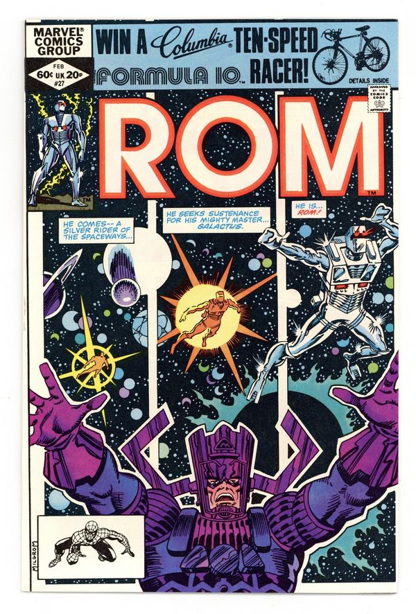 Direct Edition. Story by Bill Mantlo. Art by Sal Buscema and Joe Sinnott. Rom and the Spaceknights of Galador return to Wraithworld, the home planet of their most hated enemy. It was the setting for their greatest victory. And now they have returned with Galactus as an ally to finish what they started over two centuries ago. However, there reside things in the Dark Nebula that even the Devourer of Worlds may fear. Meanwhile, back on Earth, the Dire Wraiths, taking full advantage of Rom's absence, have invaded the small West Virginia town of Clairton. 32 pages. Cover price $0.60.