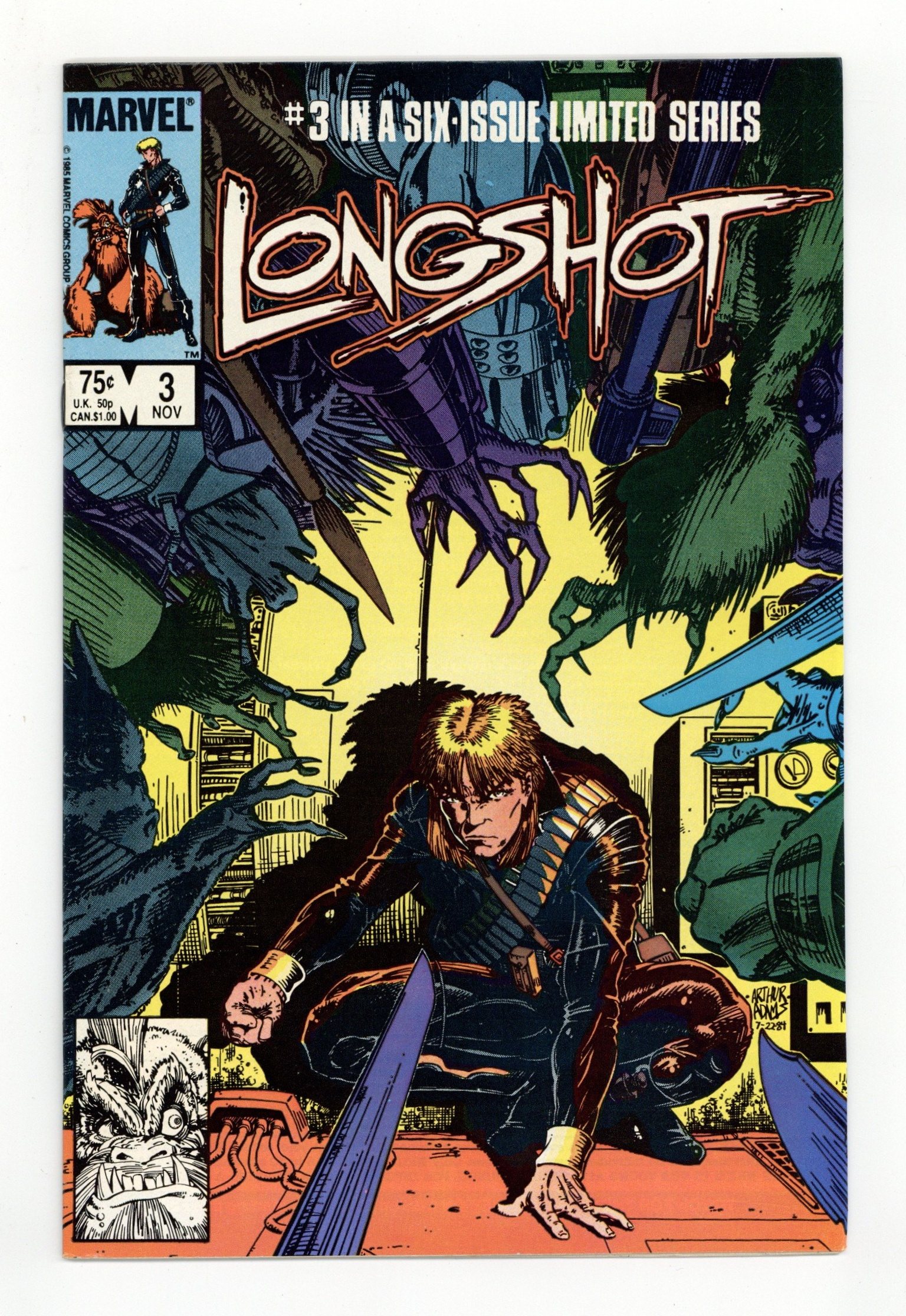 Direct Edition. Written by Ann Nocenti. Art by Arthur Adams, Whilce Portacio, and Scott Williams. Cover by Arthur Adams. Just Let Me Die; Tired of his mind numbing domestic life, middle-aged loser Theo leaps from a bridge to his death; Instead of dying, however, he instead lands on Longshot who was dumped in the river at the end of last issue; He begins to tell Longshot his everyday woes including the fact that Con Edison rips him off in charging excessive amounts for electrical power; The naive Longshot decides to break into Con Ed and steal a cache of diamonds to pay Theo his money back; The pair make it into the power plant and the wires and machinery spark a few of Longshot's memories about his home world; They get the diamonds but are attacked by Spiral, Gog and their allies who are after the same thing; During the ensuing battle, machinery gets destroyed and blacks out all of New York City. 36 pgs., full color. $0.75. Cover price $0.75.