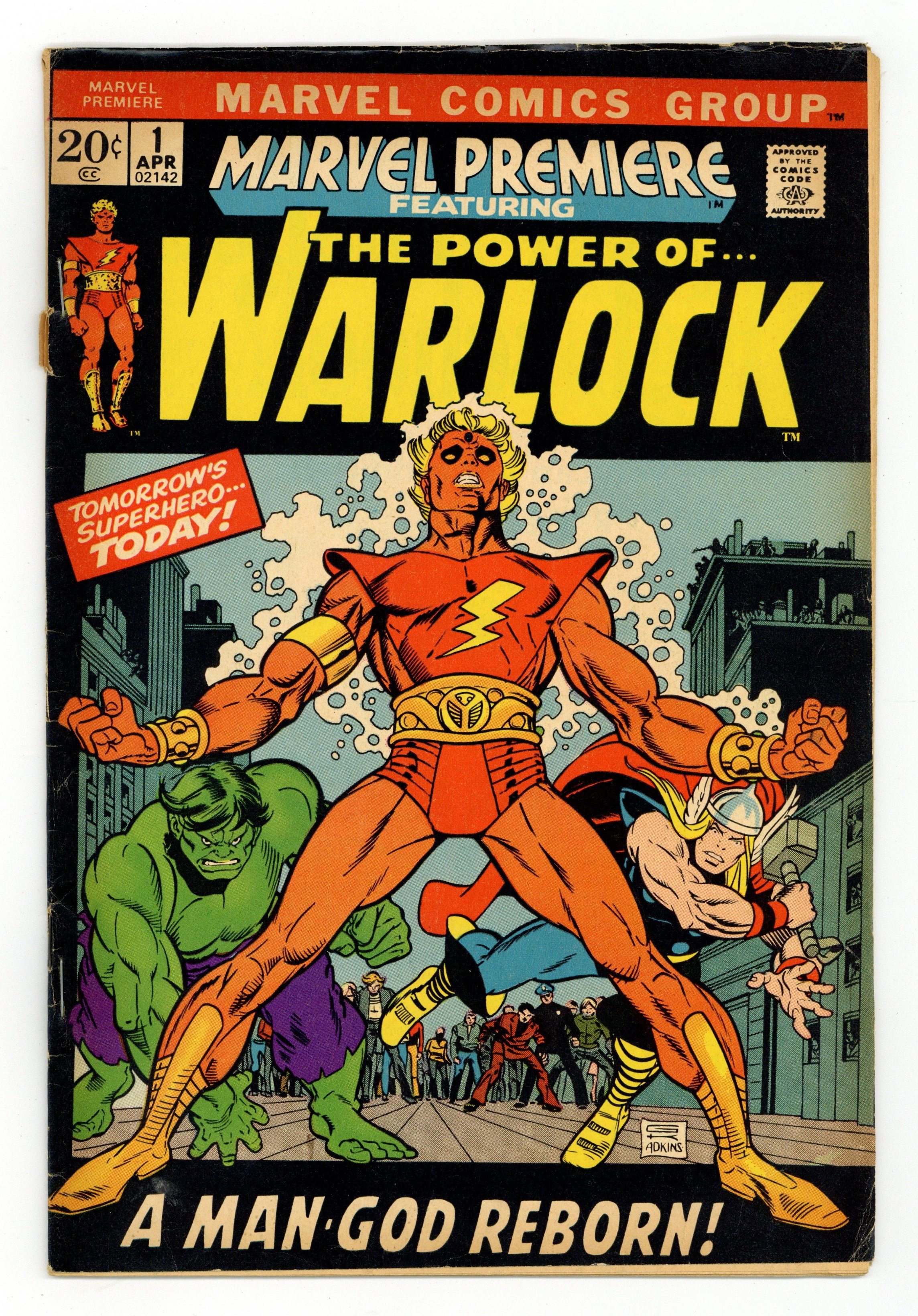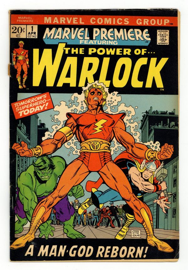 Starts Mar 16 Origin of Warlock and Counter-Earth in "And Men Shall Call Him Warlock!" Script by Roy Thomas, pencils by Gil Kane, inks by Dan Adkins. This is the first appearance of Warlock, who was previously the character "Him" in Fantastic Four (see issues 66 and 67) and Thor (issues 165, 166) comics. High Evolutionary guest stars. Brief appearances by the Hulk and Thor. Kane/Adkins cover. Cover price $0.20.