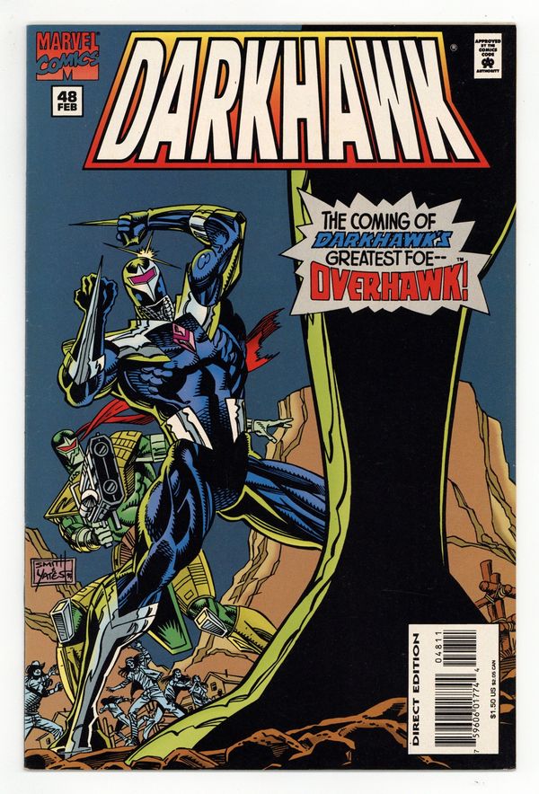 Tags: Marvel Legacy Numbering: Darkhawk (part 48)$20.00Cover pencils by Tod Smith, inks by Kevin Yates. A Hawk Supreme Part One: Overhawk starring Darkhawk, Portal, Ned, Overhawk (1st Appearance), Mike Powell, Harry Lennox, Jon, and Jason, script by Danny Fingeroth, pencils by Tod Smith, inks by Kevin Yates; Darkhawk, Portal and Ned battle the Mahari; Portal tells his origin. 36 pgs. $1.50. Cover price $1.50.