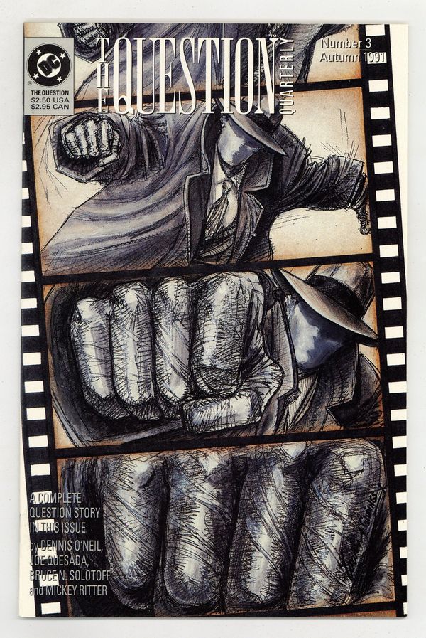 A film crew arrives in Hub City to shoot an action-adventure film, bringing a load of real guns. Add to the mix two warring street gangs hired as extras and the brutal Cathy Fregosi, who has come to steal the weapons. The result has the Question fighting for his own safety in the center of a war zone. Written by Dennis O'Neil, with art by Joe Quesada, Bruce N. Solotoff and Mickey Ritter. Cover by Denys Cowan. 52 pages. New Format. Cover price $2.50.