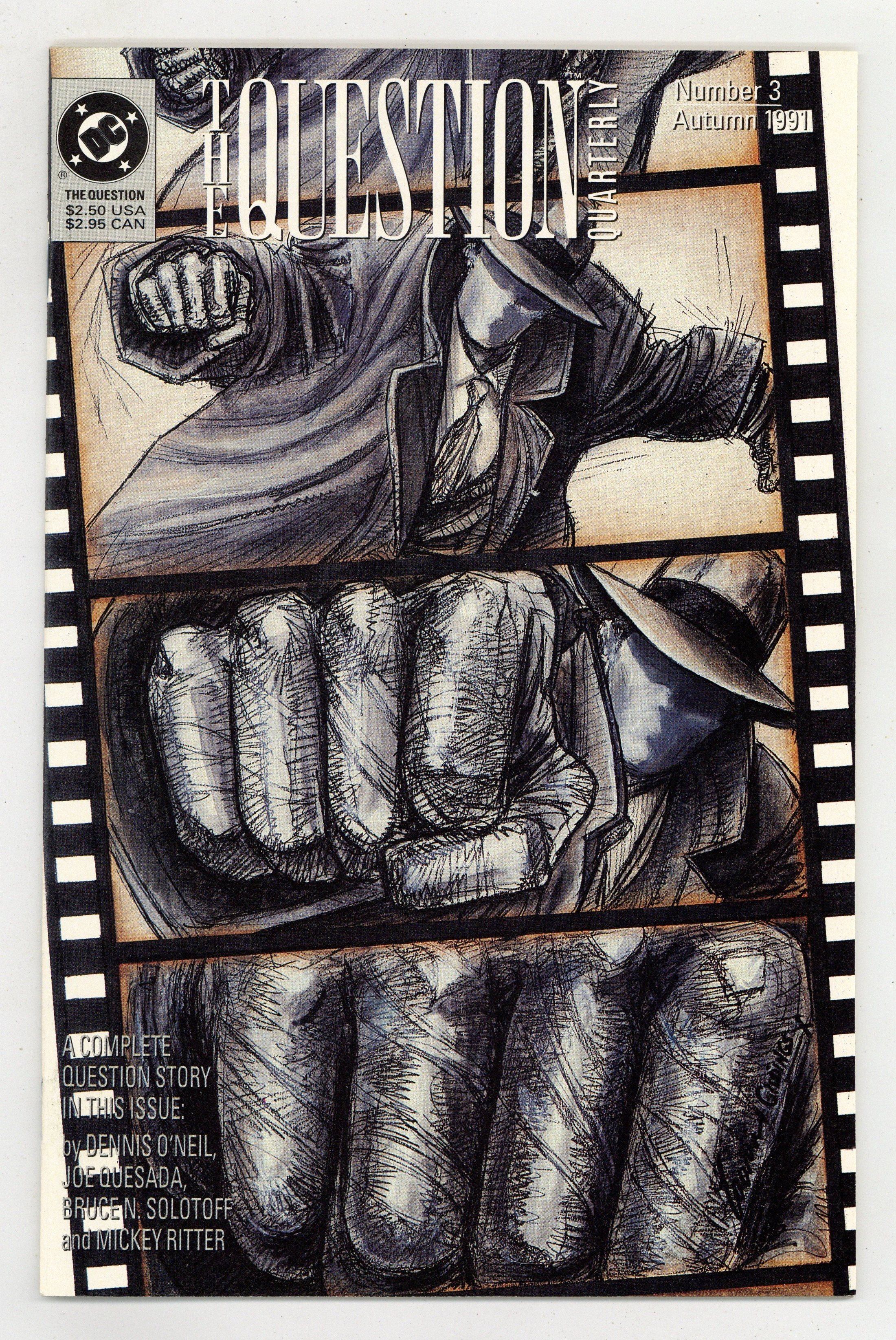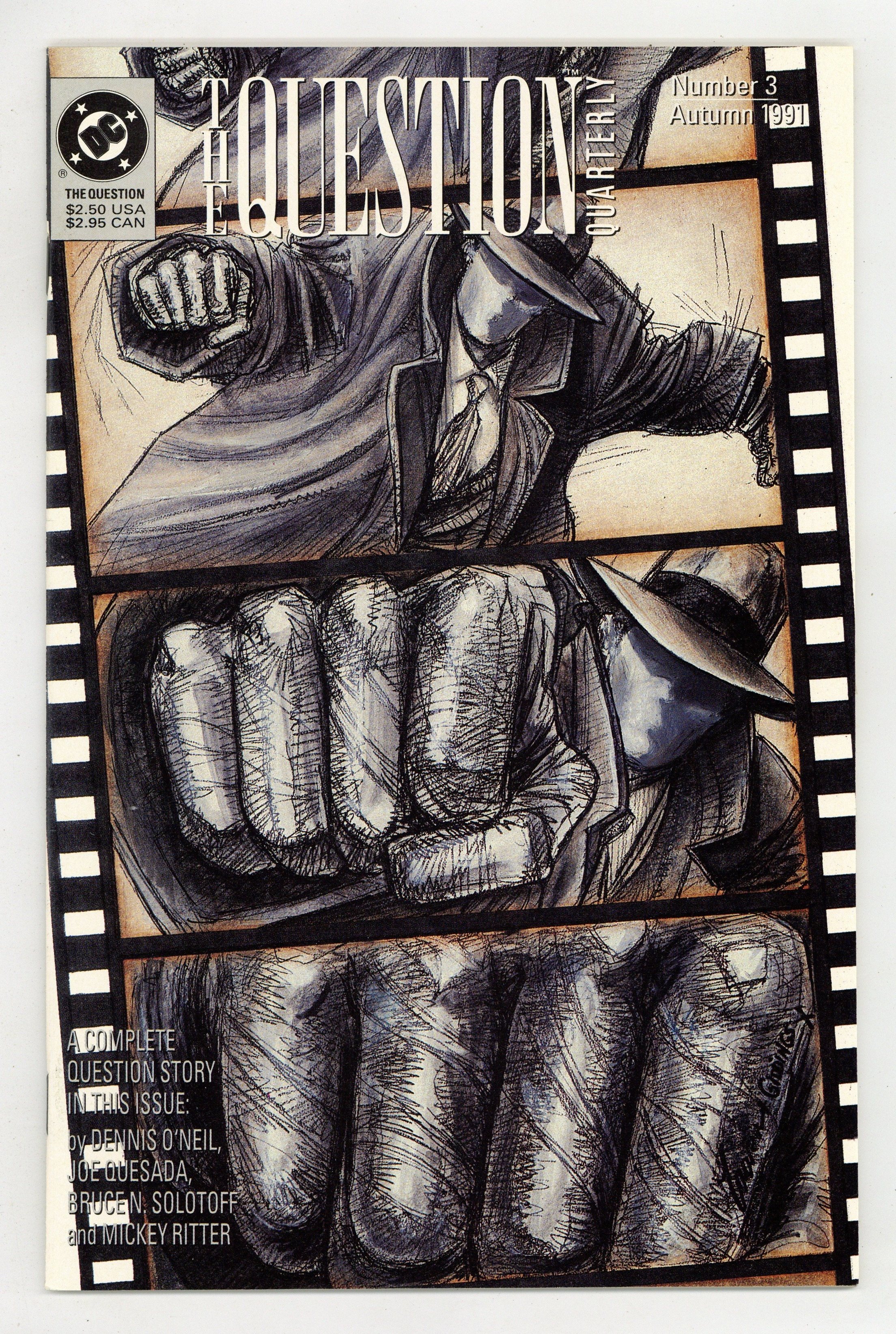 $12.00A film crew arrives in Hub City to shoot an action-adventure film, bringing a load of real guns. Add to the mix two warring street gangs hired as extras and the brutal Cathy Fregosi, who has come to steal the weapons. The result has the Question fighting for his own safety in the center of a war zone. Written by Dennis O'Neil, with art by Joe Quesada, Bruce N. Solotoff and Mickey Ritter. Cover by Denys Cowan. 52 pages. New Format. Cover price $2.50.