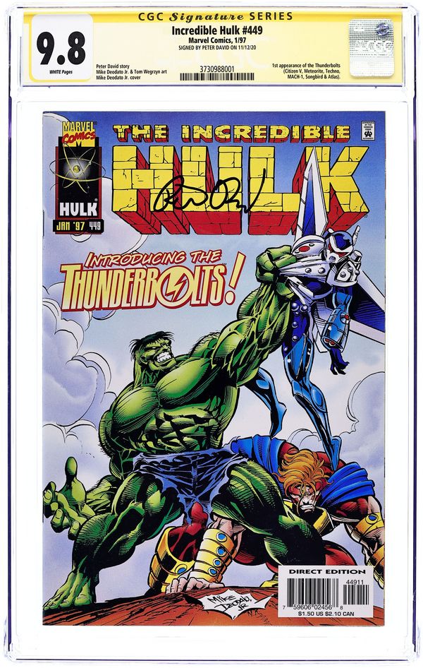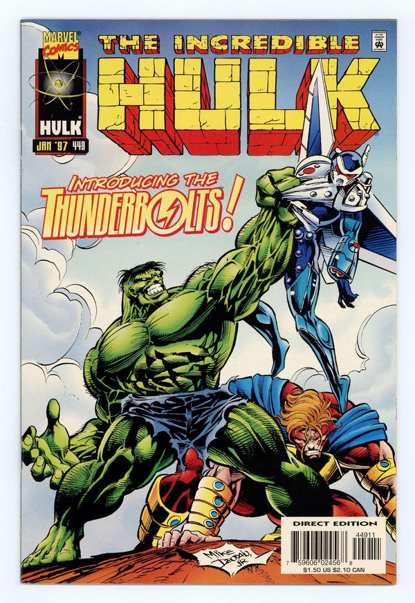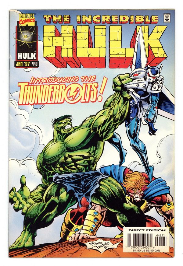 Tags: Marvel Legacy Numbering: Hulk (part 449), Hulk$48.00Direct Edition. Cover by Mike Deodato Jr. It's the first appearance of the Thunderbolts in the aptly-titled "Introducing the Thunderbolts," script by Peter David, pencils by Mike Deodato Jr., inks by Tom Wegrzyn; Hulk and Janis are attacked by the Thunderbolts; Hulk is hurt during the fight, and breaks the wall of a dam to switch their attention onto saving citizen lives; At the end of the issue we see the Hulk falling on his knees, grabbing his chest. Characters: Hulk (Bruce Banner); Thunderbolts (Citizen V; Mach-1; Songbird; Techno; Atlas; Meteorite) ; Janis Jones. 36 pgs., full color. $1.50. Cover price $1.50.