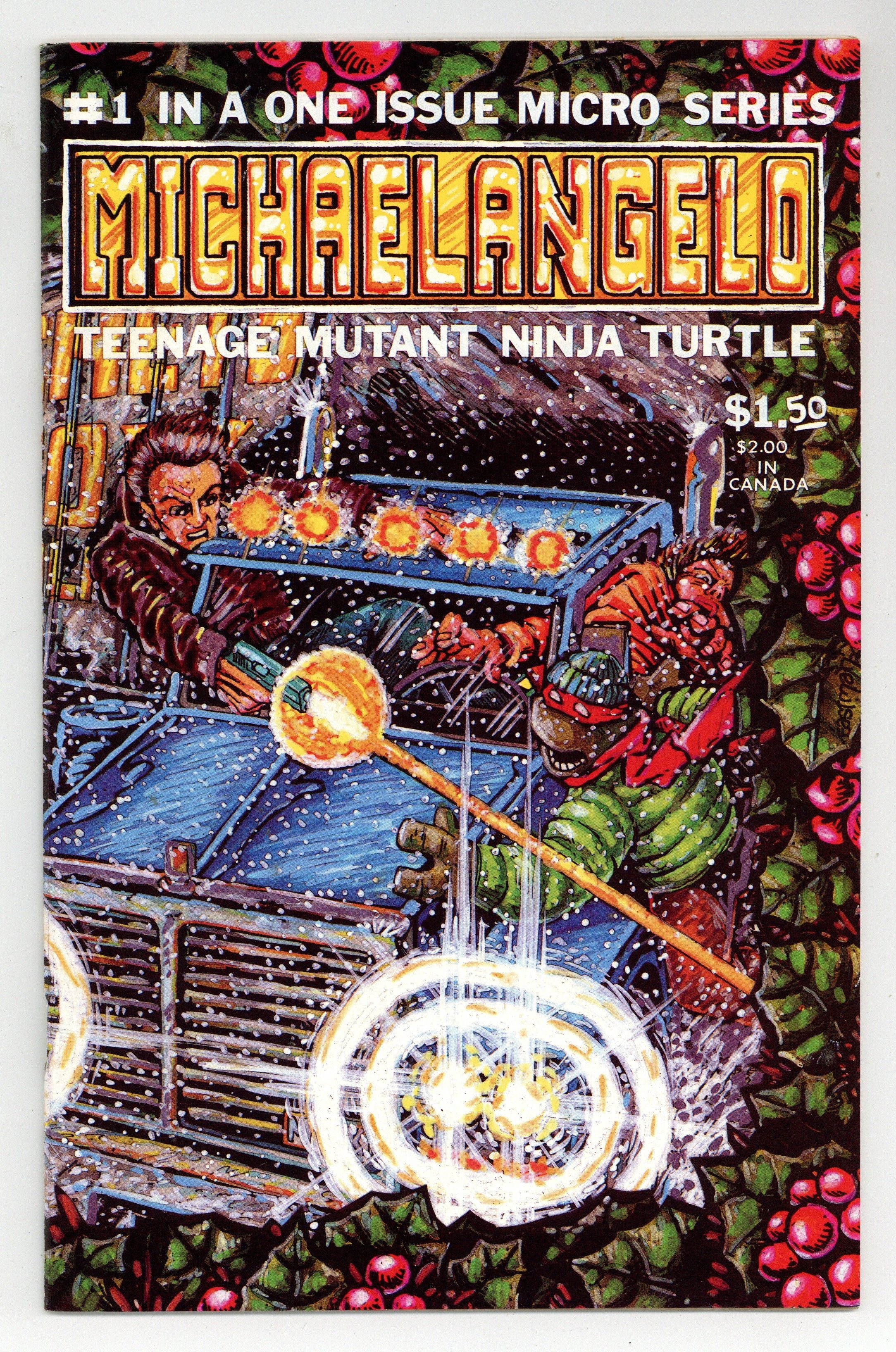 Michaelangelo of the Teenage Mutant Ninja Turtles has a solo Christmas adventure, as he battles hoodlums who have hijacked a truck full of toys intended for an orphanage. Part of a series of one-shots featuring the Turtles in solo stories. Story and art by Kevin Eastman and Peter Laird. Backup story featuring Gizmo; story and art by Michael Dooley. Black and white; 44 pages. Wraparound cover by Eastman. Cover price $1.50. Cover price $1.50.